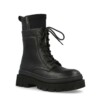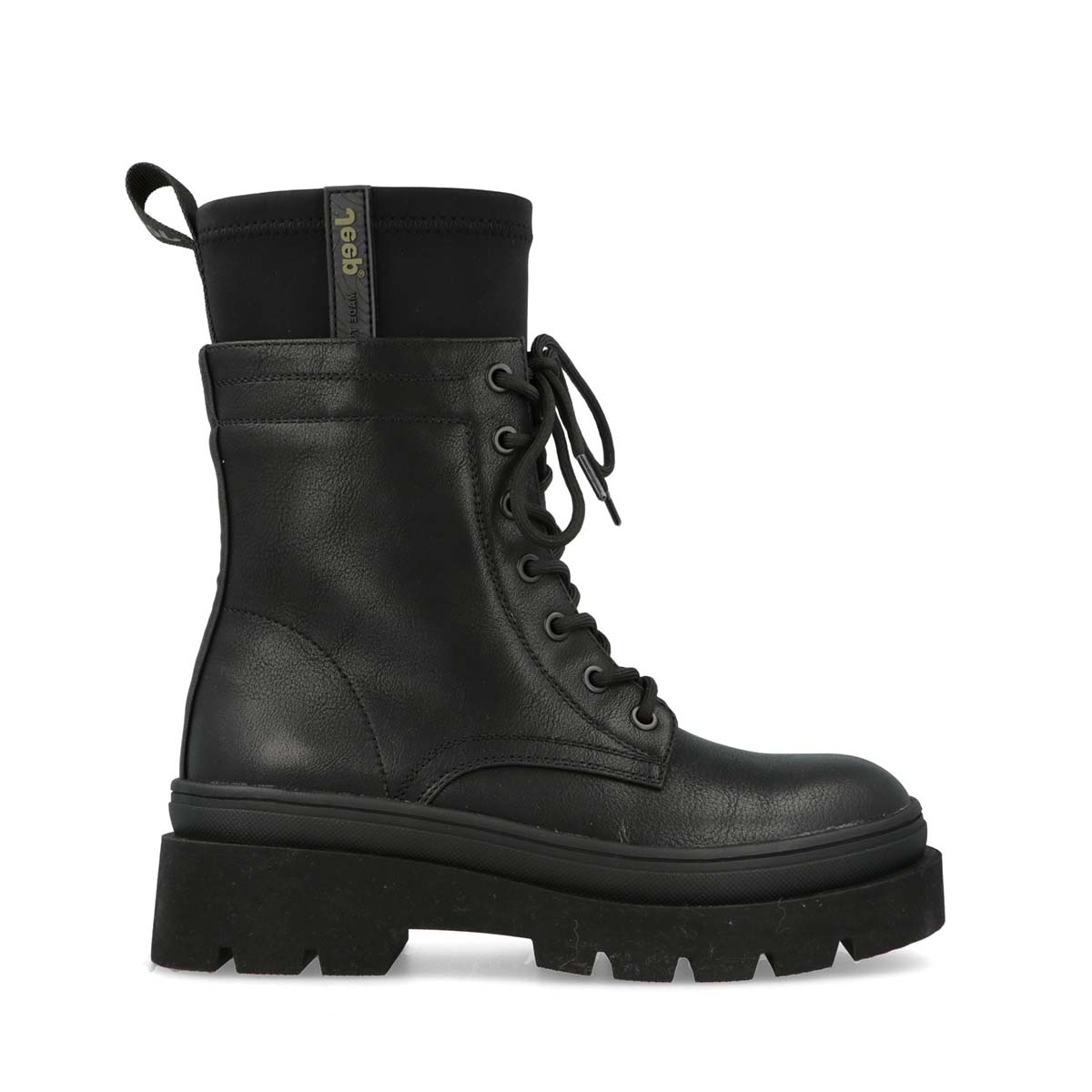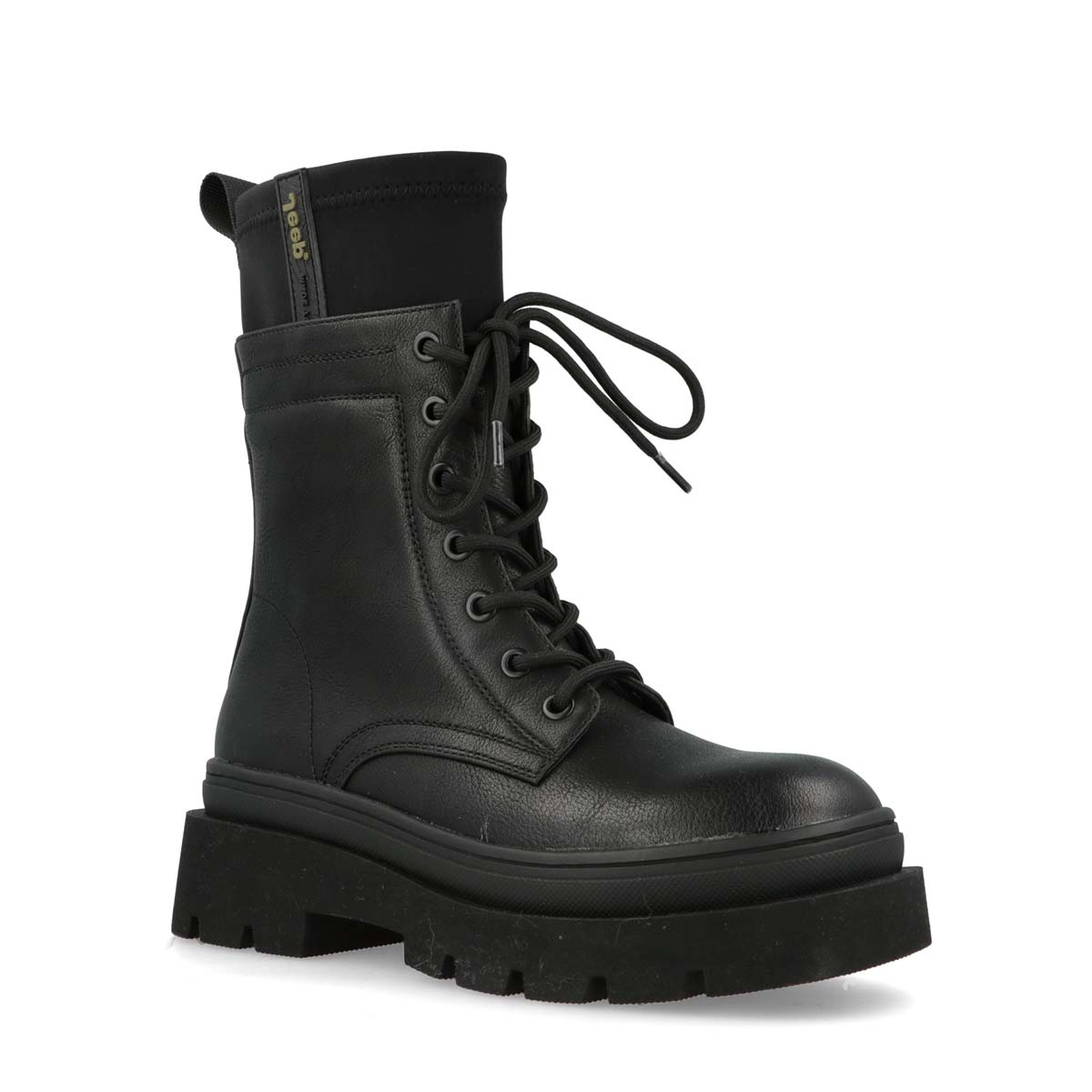 Anfibi donna in pelle con bordo in tessuto Jeep. Chiusura con lacci agevolata dalla zip sul lato interno. Leggeri su fondo gomma roccia 5 cm.