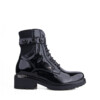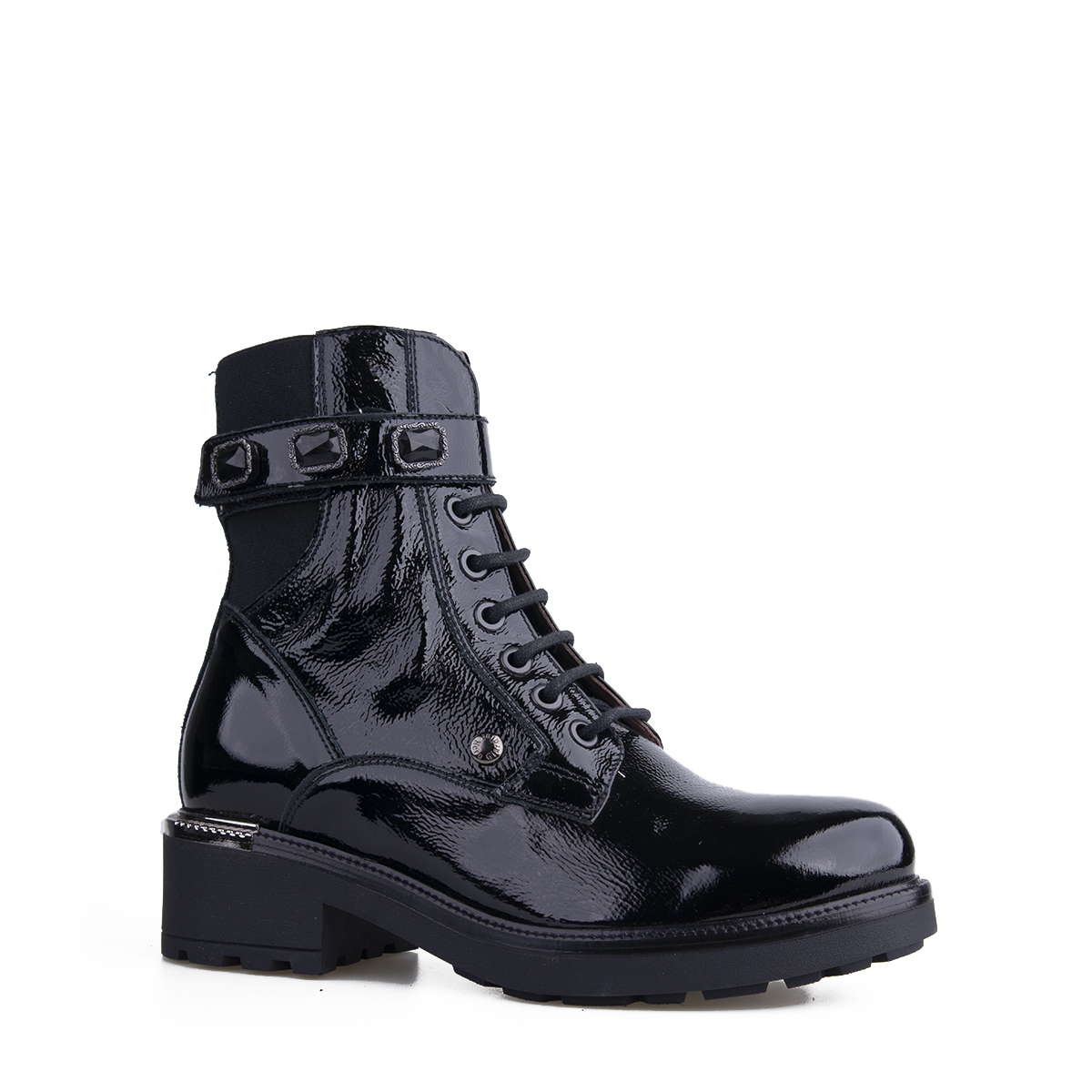Anfibio allacciato in vernice con cinturino alla caviglia arricchito da pietre metal tono su tono. Fondo roccia con piastra per un perfetto stile rock.