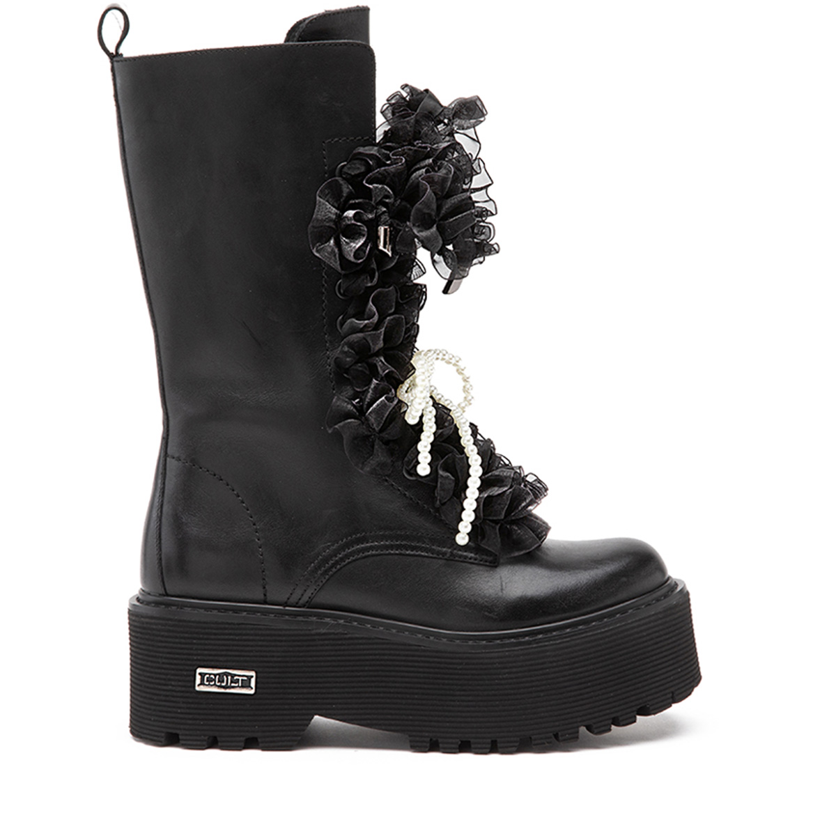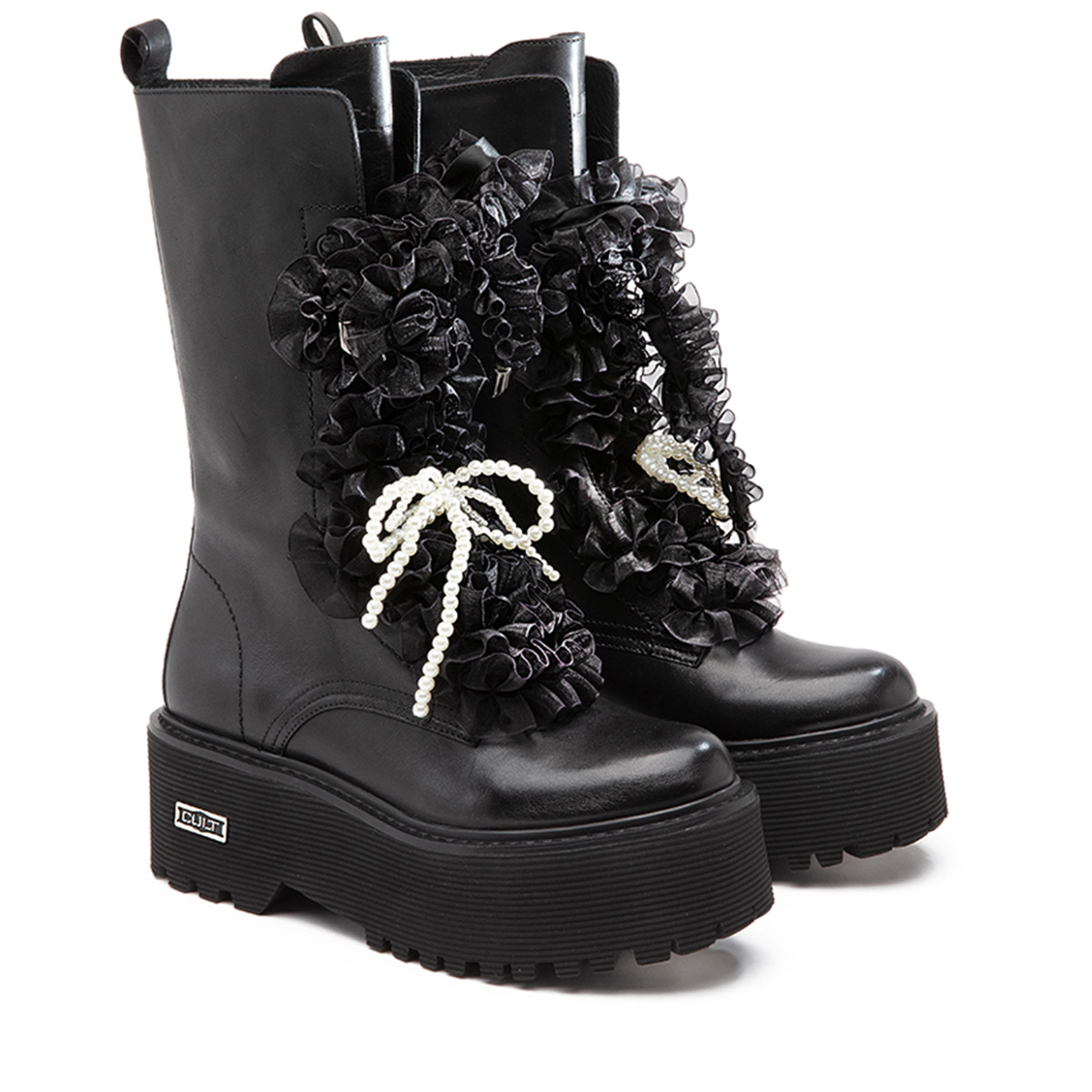 Anfibi in pelle nera con suola in gomma alta 6 cm.