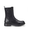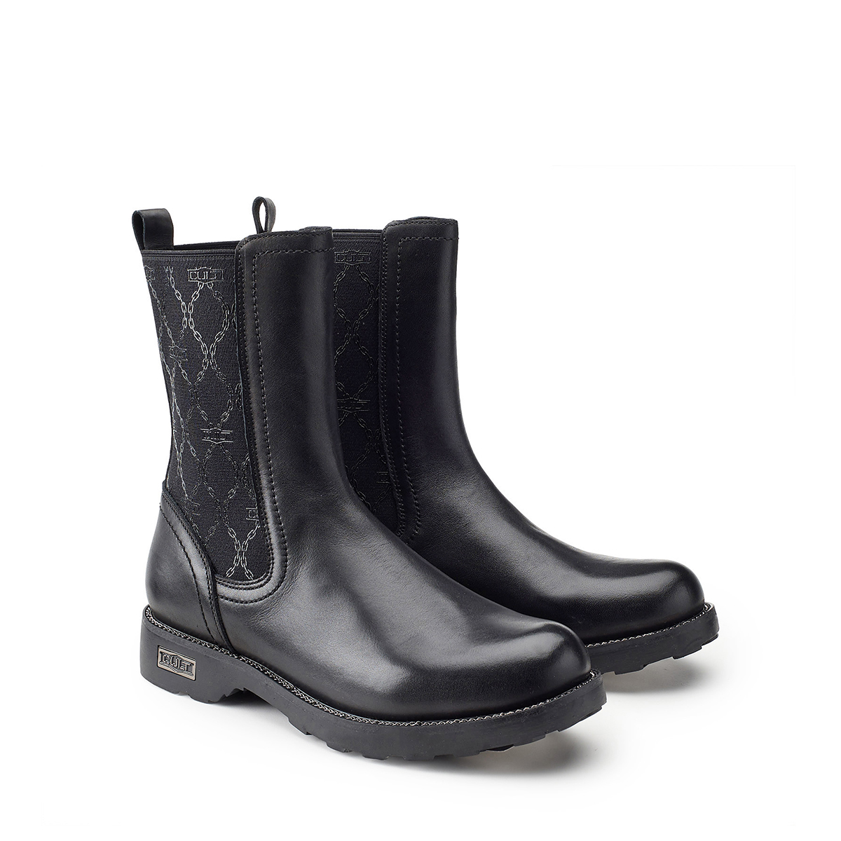 Cult eleva i classici stivaletti da donna Chelsea in pelle nera e gambale scultoreo, ideale con lunghezze cropped. Il modello è montato su suole carrarmato e rifinito con l’iconico guardolo zip e targhetta metallica. Gli inserti laterali elasticizzati impreziositi con la stampa spessorata shiny all-over con pattern catena, rendono la calzata più comoda.