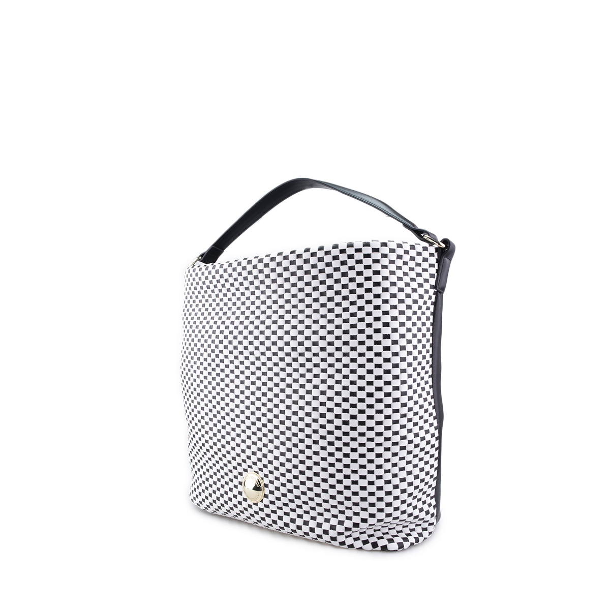 Sacca in pelle con lavorazione geometrica bicolore.