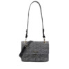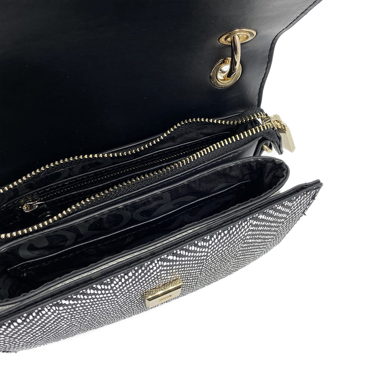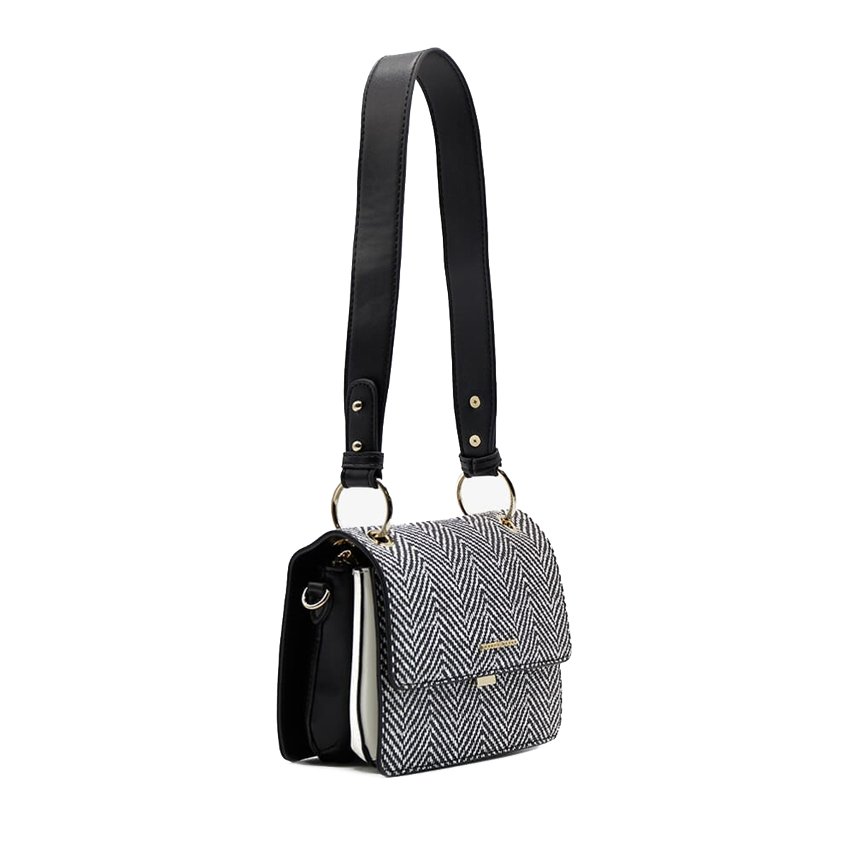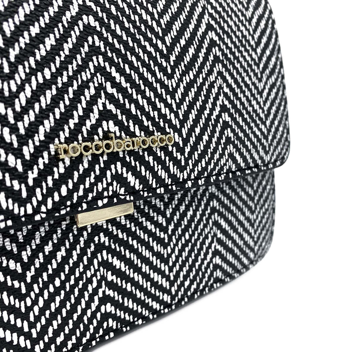 Pattina rigida in saffiano con stampa Chevron Bianco/nero e riporti in nero. Ha doppia tracolla, di cui una è una catena nera.