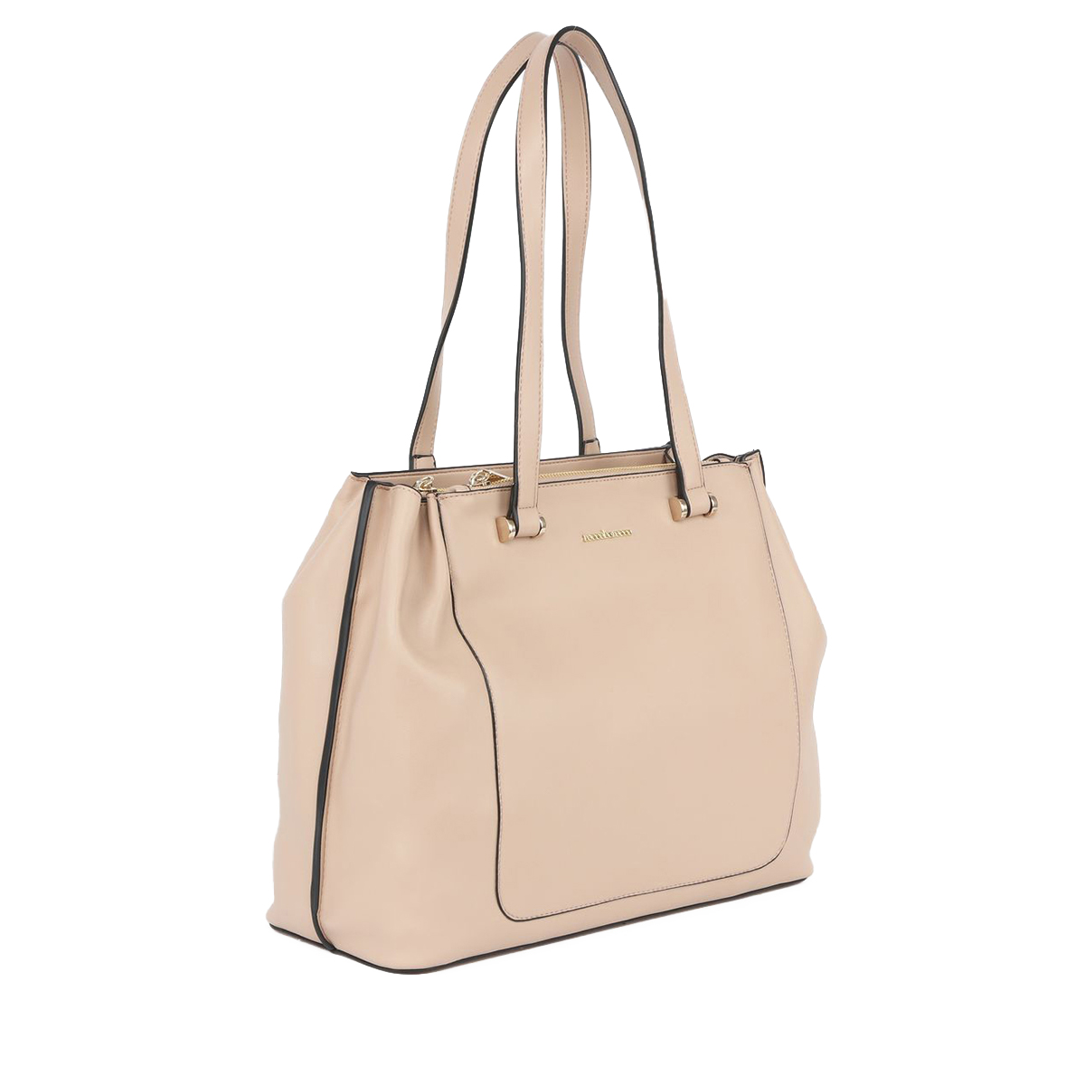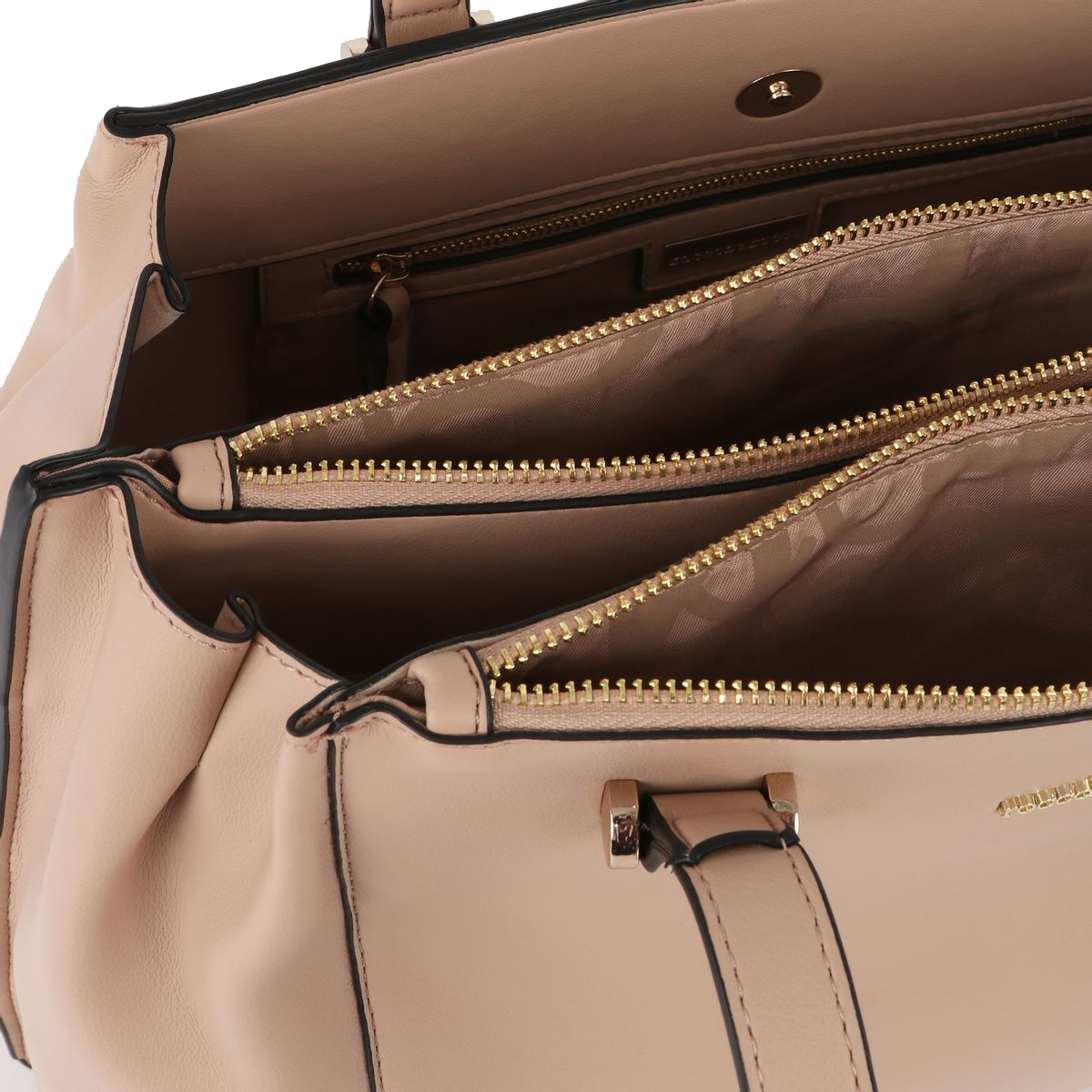 Shopping a spalla in grana piccola con logo Roccobarocco in metallo e ciondolo con strass. Con tre scomparti, quello centrale chiuso da zip, gli esterni con chiusura magnetica.