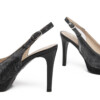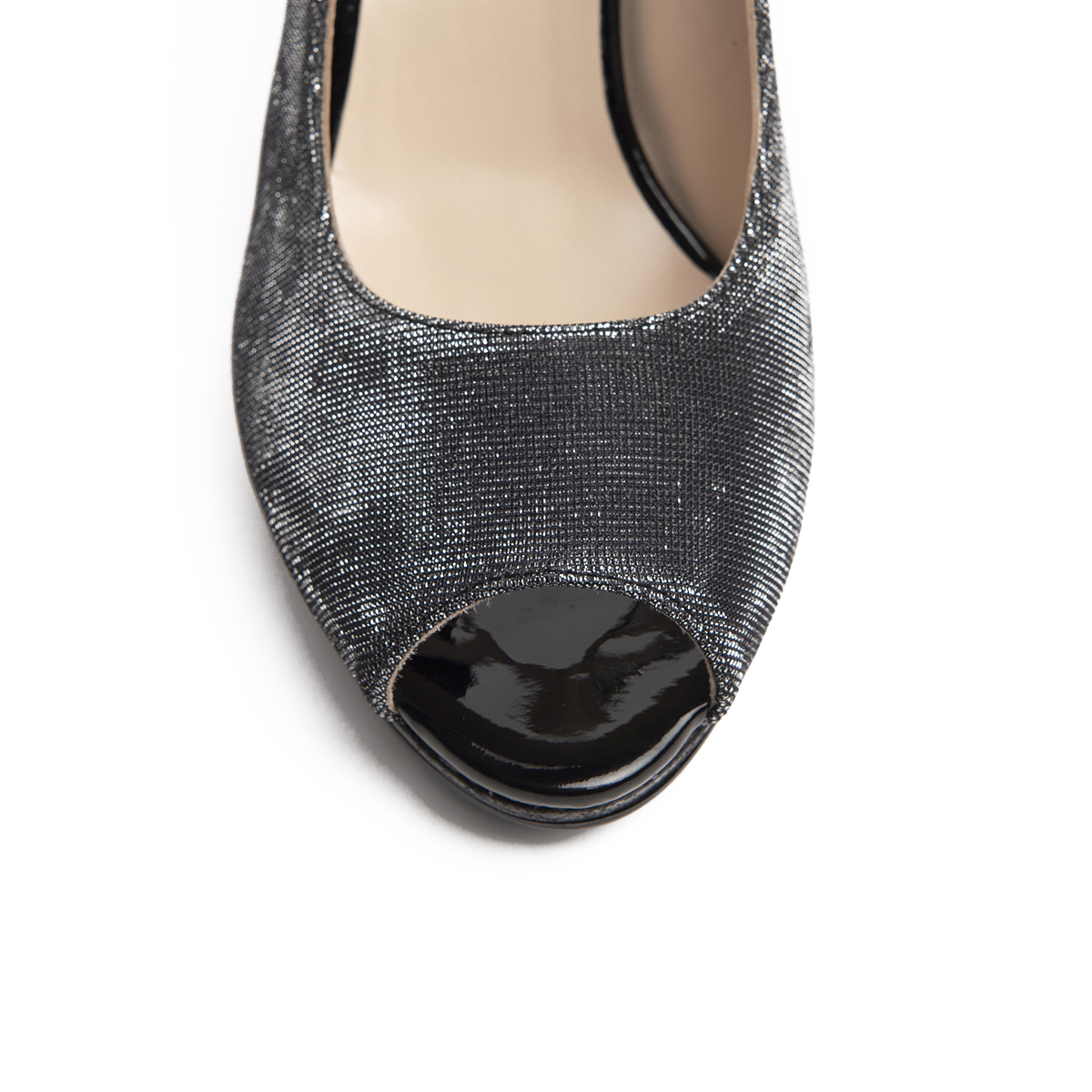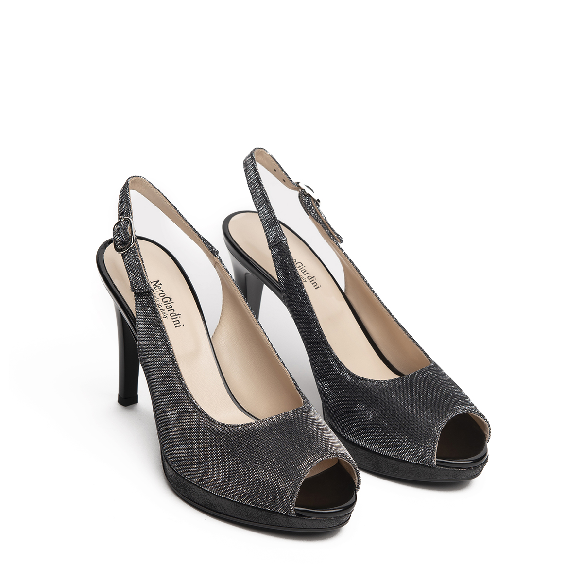 Slingback open toe in tessuto tecnico glitterato. Tacco di 9,5 cm abbinato ad un comodo plateau di 1,5 cm ricoperto in pelle laminata. Design elegante e materiali sparkling per un look che non passa inosservato.