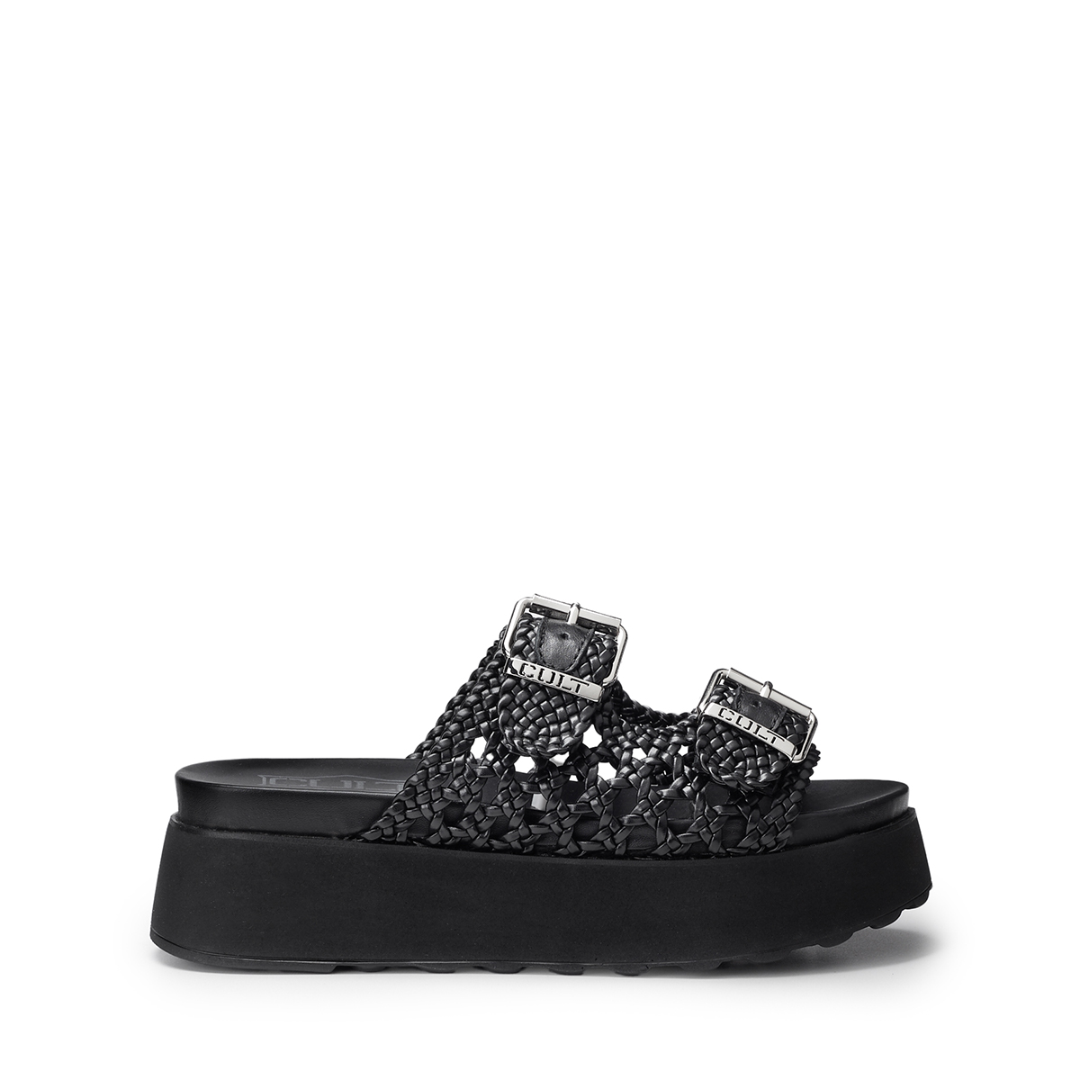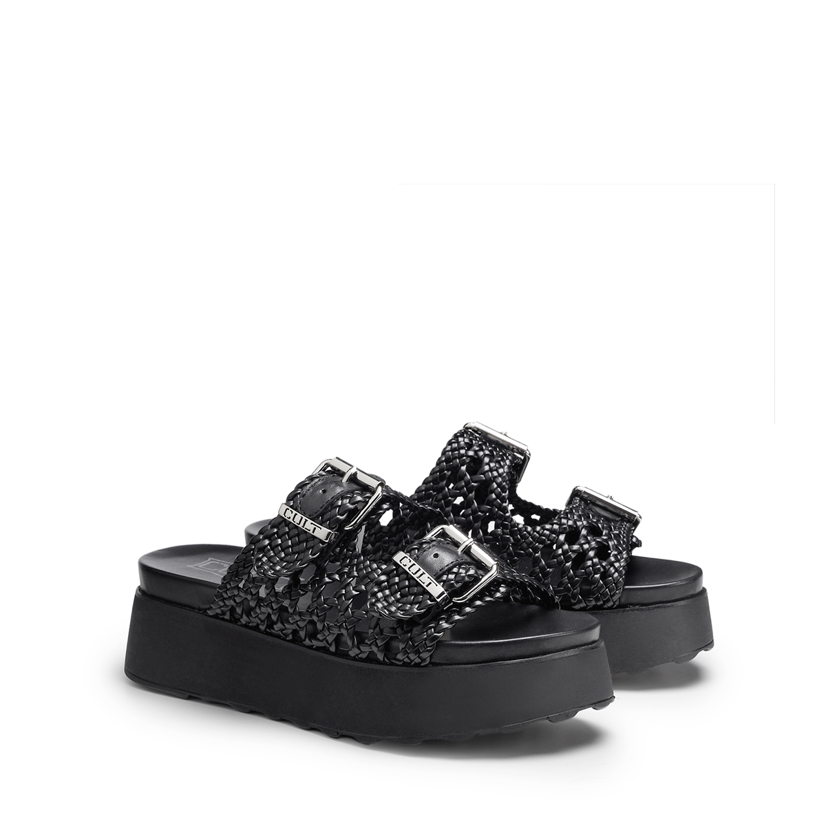 Attuali e alla moda, senza rinunciare alla propria anima rock, questo nuovo modello JANIS firmato Cult per l’estate 2025 diventerà un vero e proprio must-have. Due fasce in pelle nera con lavorazione intrecciata impreziosite da fibbie in metallo con logo Cult inciso e suola platform per questi sandali da abbinare a ogni outfit per un look decisamente glam rock.