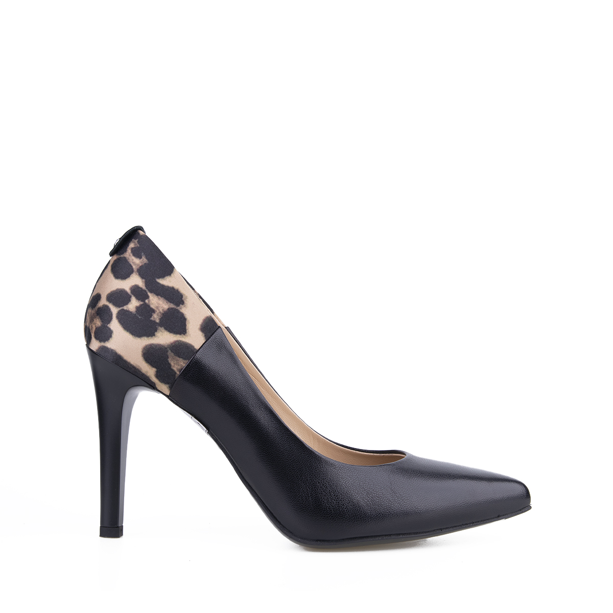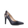 Decolletè in pelle con punta affusolata e tessuto tecnico con stampa animalier . Tacco a stiletto di 10 cm. Design grintoso per la scarpa must-have del guardaroba femminile. Colore nero.