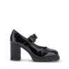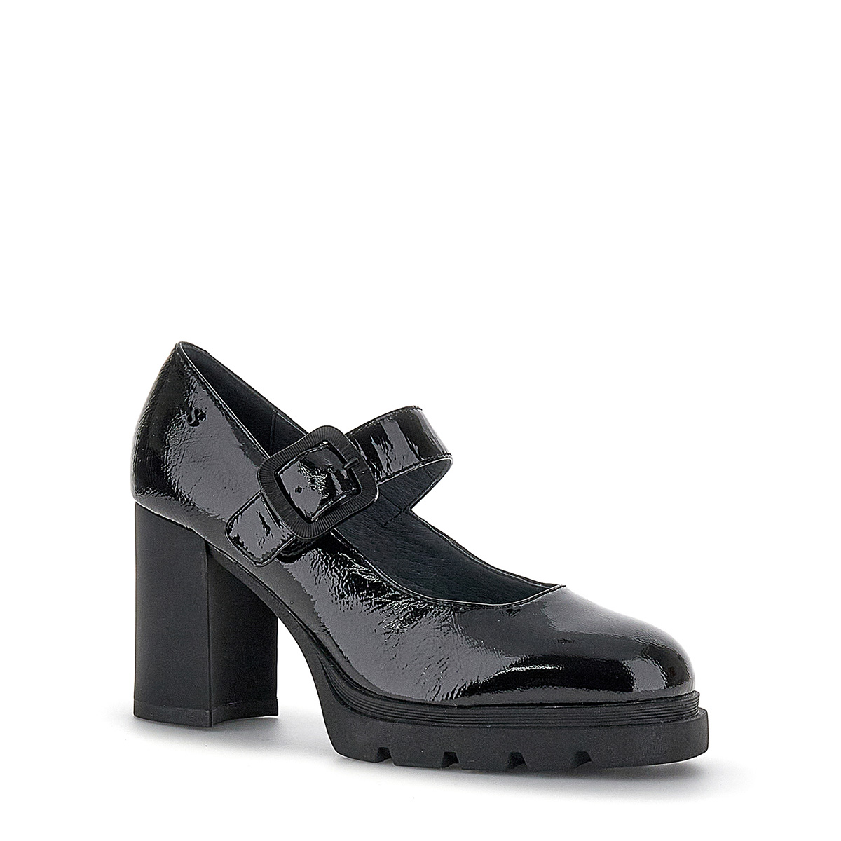 Decolletè Pumps in pelle vernice con tacco e plateau. Il cinturino sul collo piede ha un’invito elastico sotto la fibia che agevola la calzata.