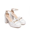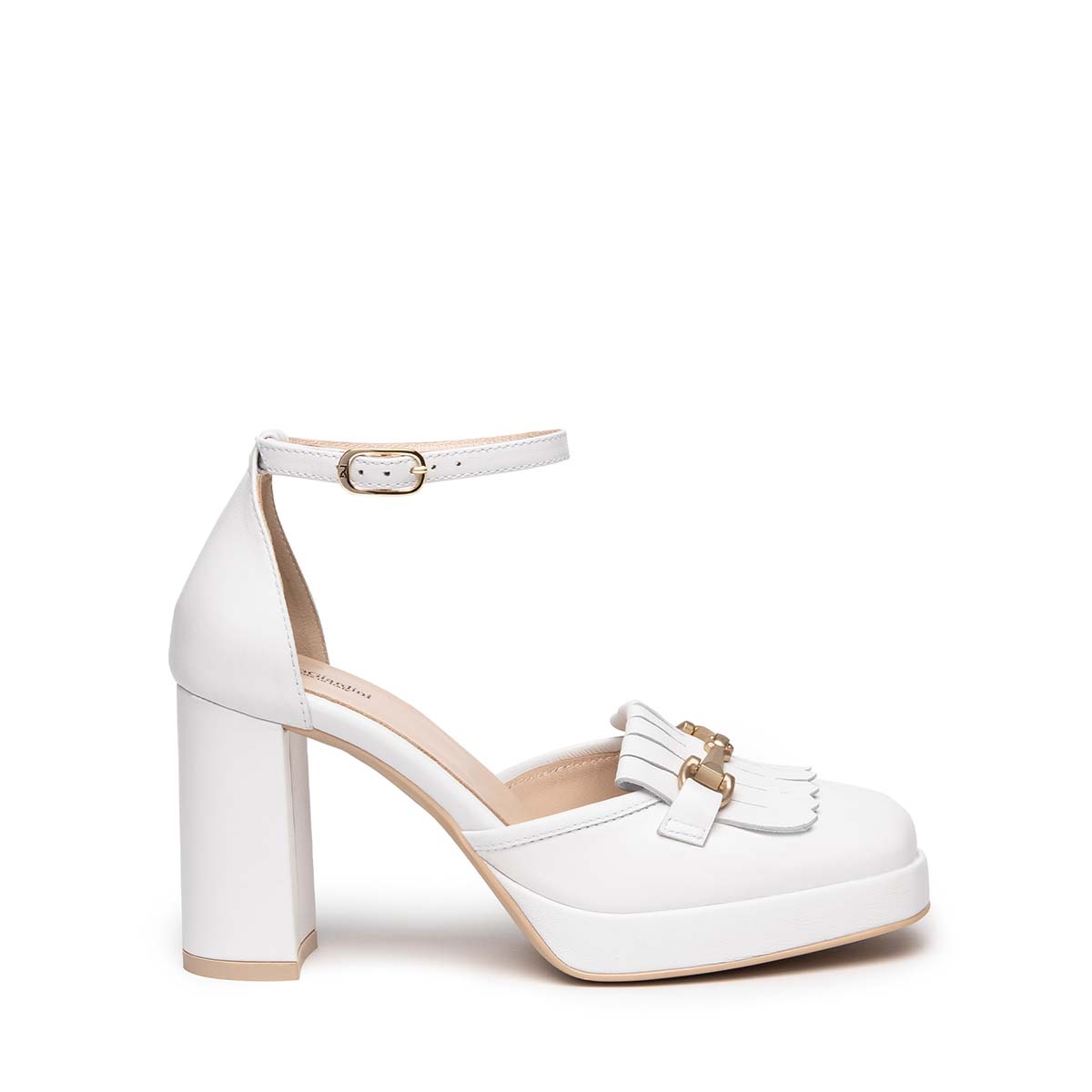 Décolleté da donna Nerogiardini con chiusura con cinturino alla caviglia regolabile con fibbietta in metallo. Tomaia in vera pelle con punta impreziosita da un morsetto metallico e da frange applicate. Il tacco largo e il plateau le rendono comode da indossare durante i mille impegni della giornata.