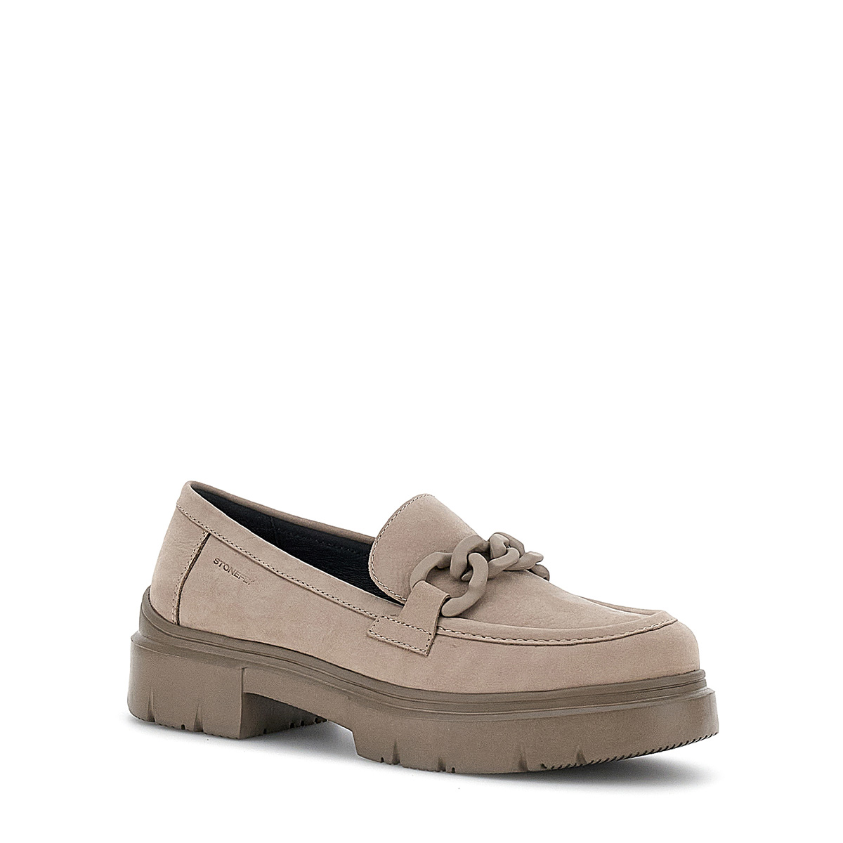 Mocassino da donna in camoscio con catena tono su tono e sottopiede in pelle. L’articolo 219930 062 ha il fondo in gomma alto 3.5 cm.