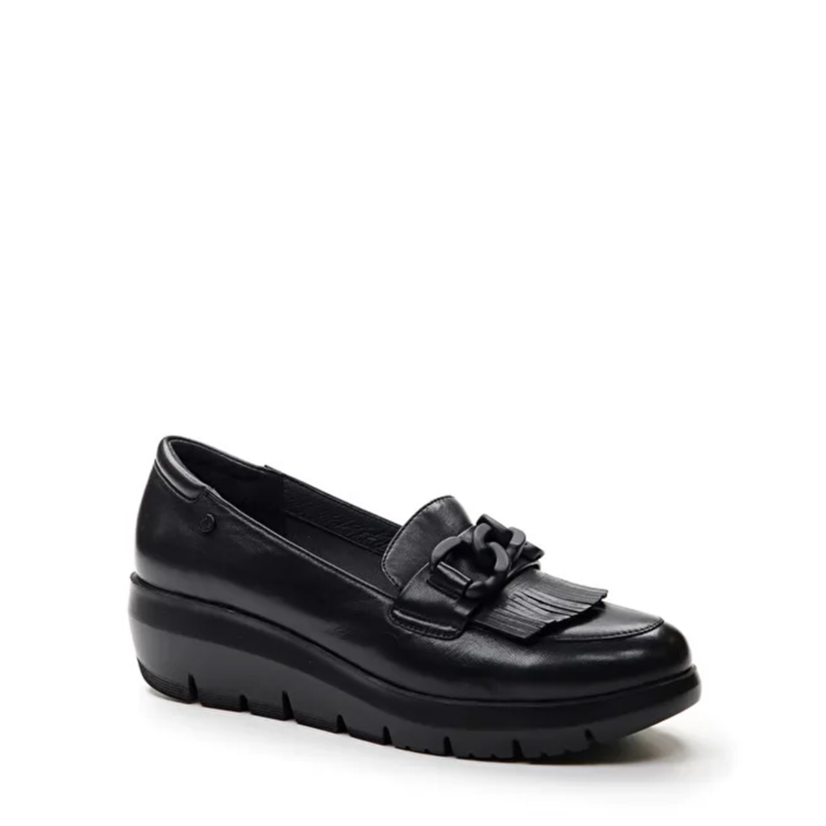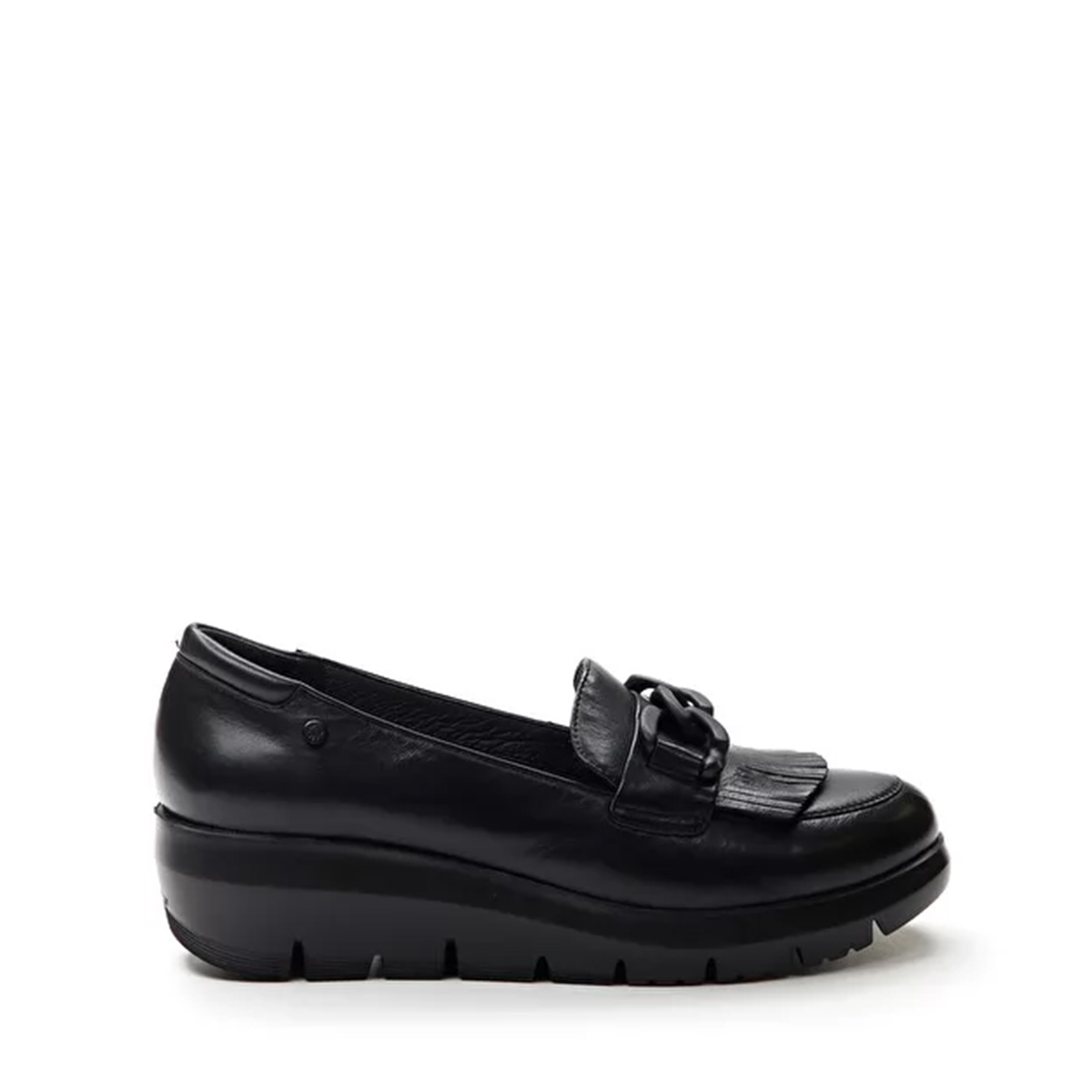 Mocassino Plume in pelle, catena e frangia frontale, sottopiede imbottito in pelle, fondo gomma alto 4 cm