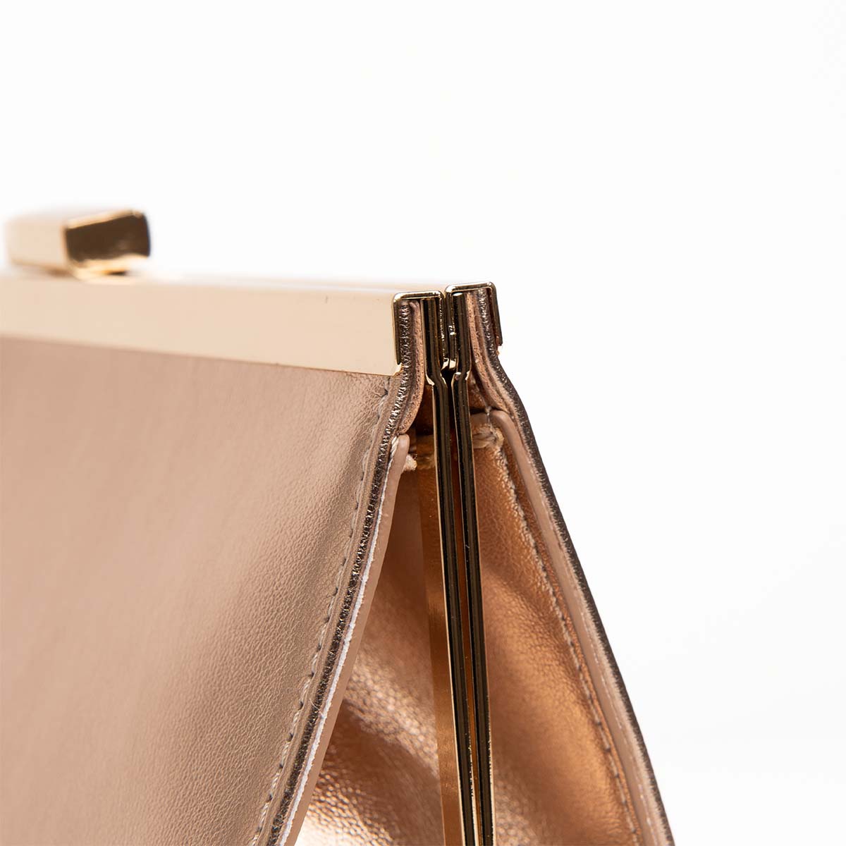 Pochette elegante in laminato con tracolla rimovibile a catena, chiusura con bottone a scatto.