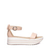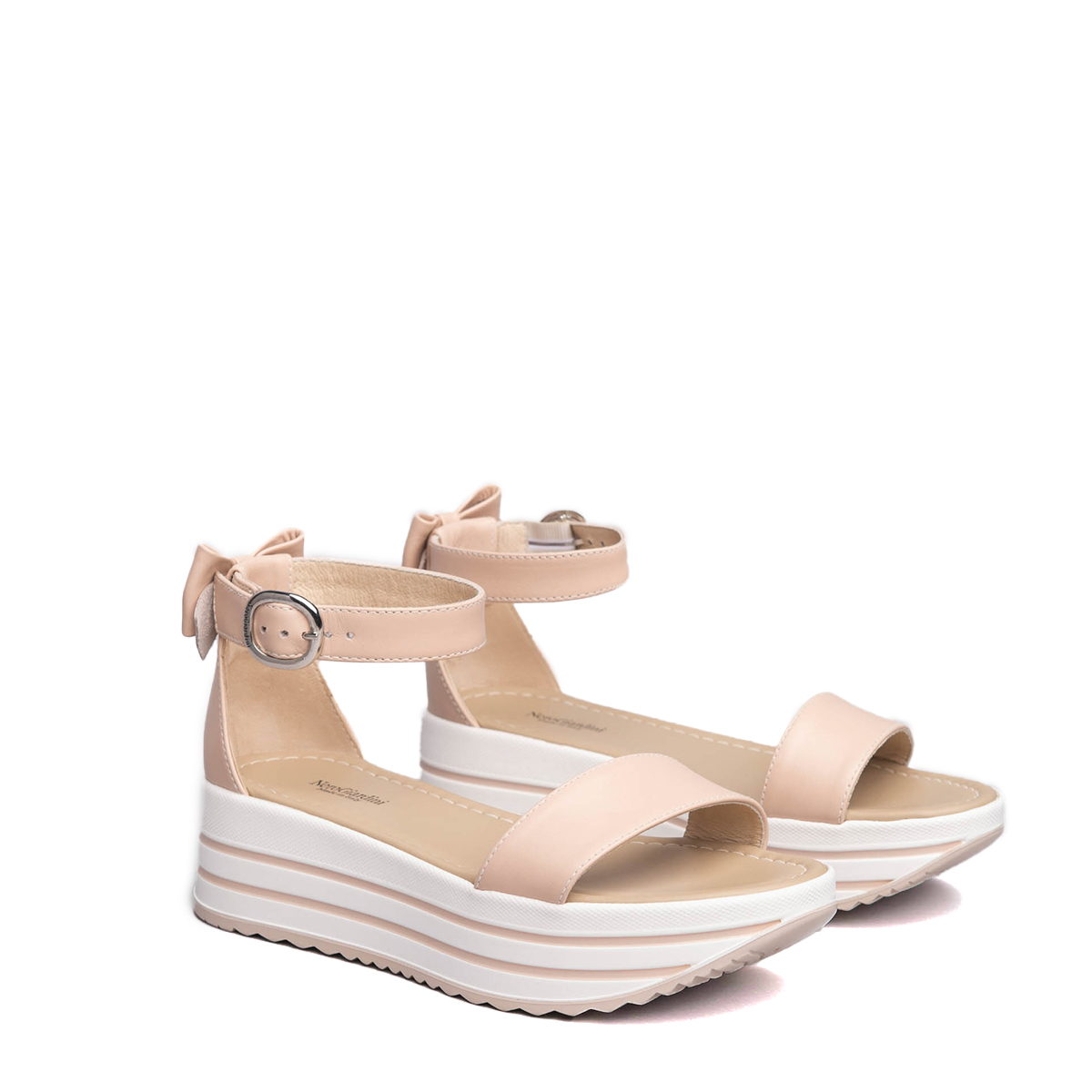 Sandali in pelle con cinturino alla caviglia e fiocco in pelle posizionato nella parte posteriore della calzatura. Fondo platform bicolore di 4,5 cm. Design minimale per un look romantico e di tendenza.