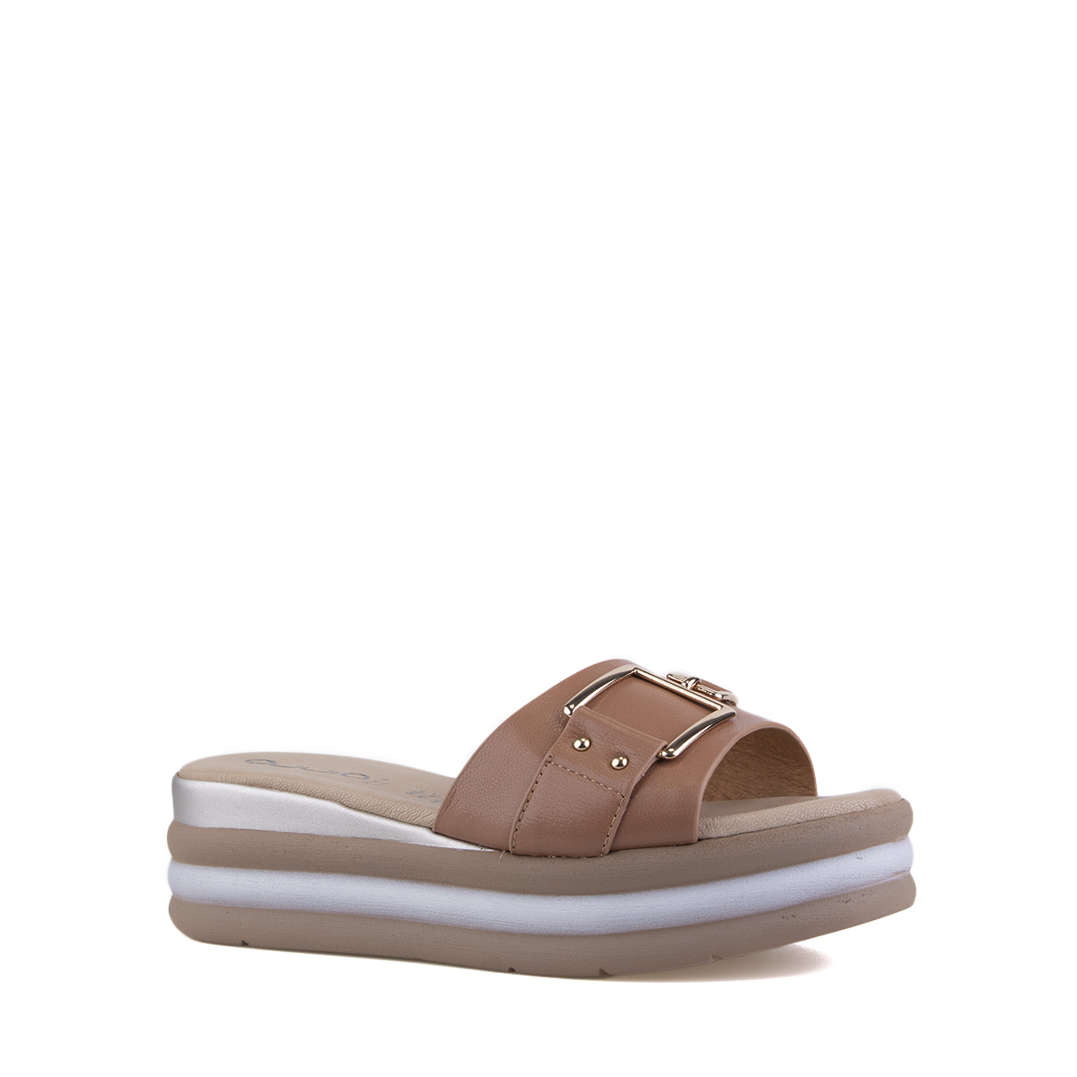 Sandalo ciabatta Donna in pelle e fibbiona. Il sottopiede in pelle favorisce una calzata comoda e confortevole.