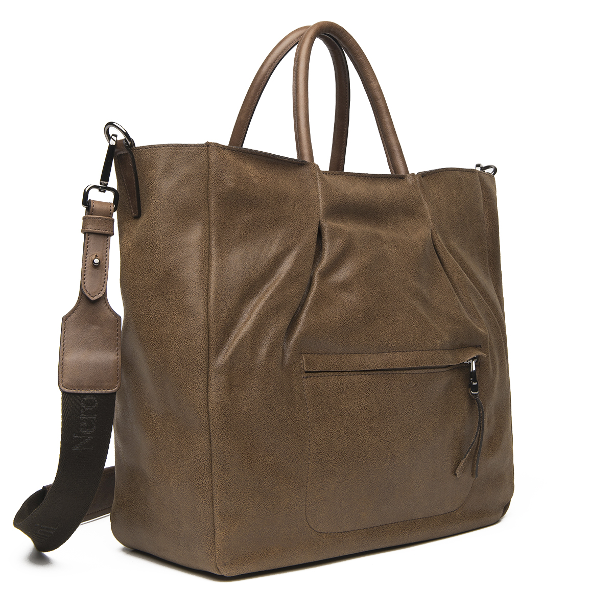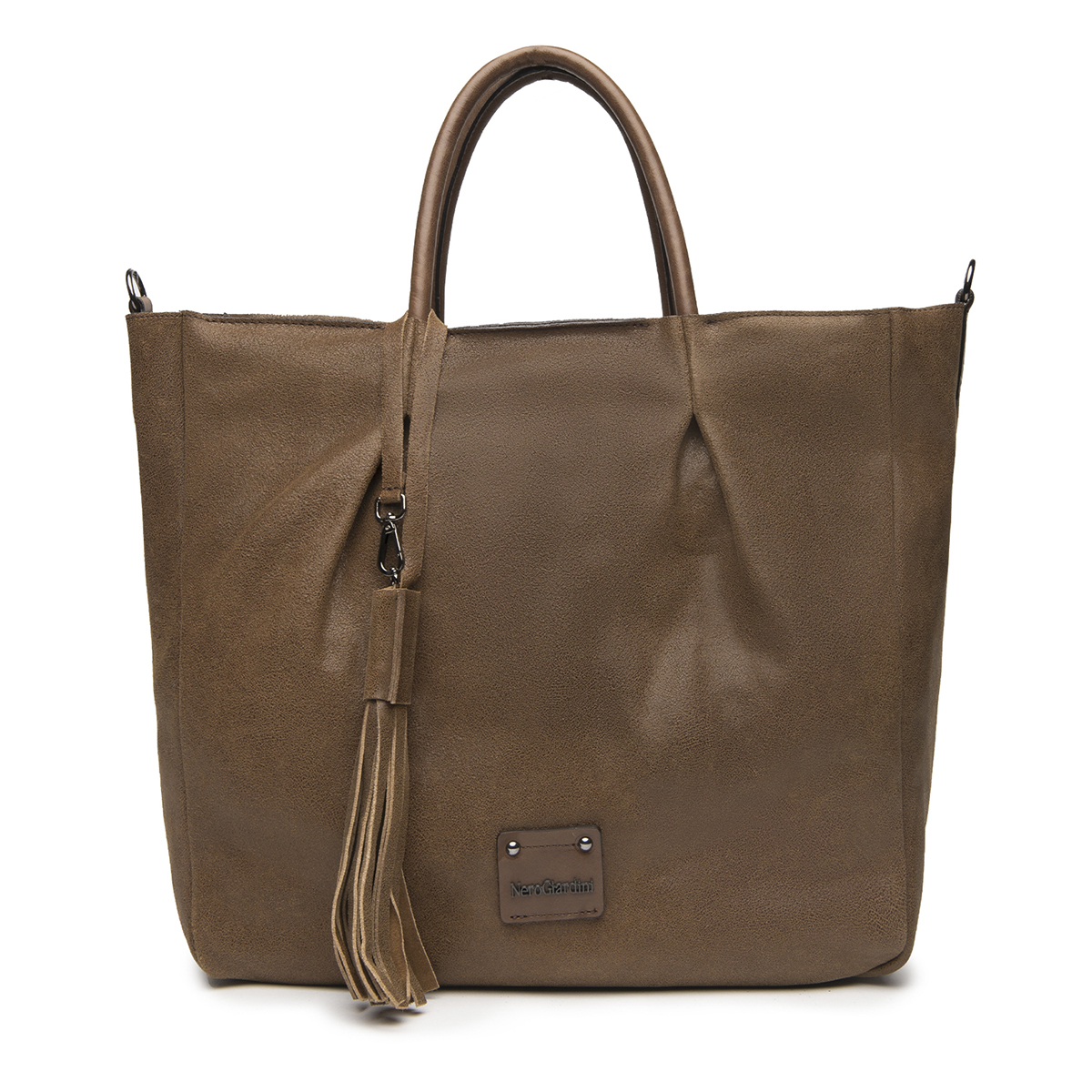 Borsa shopping realizzata in morbida pelle con maxi nappina decorativa removibile.
