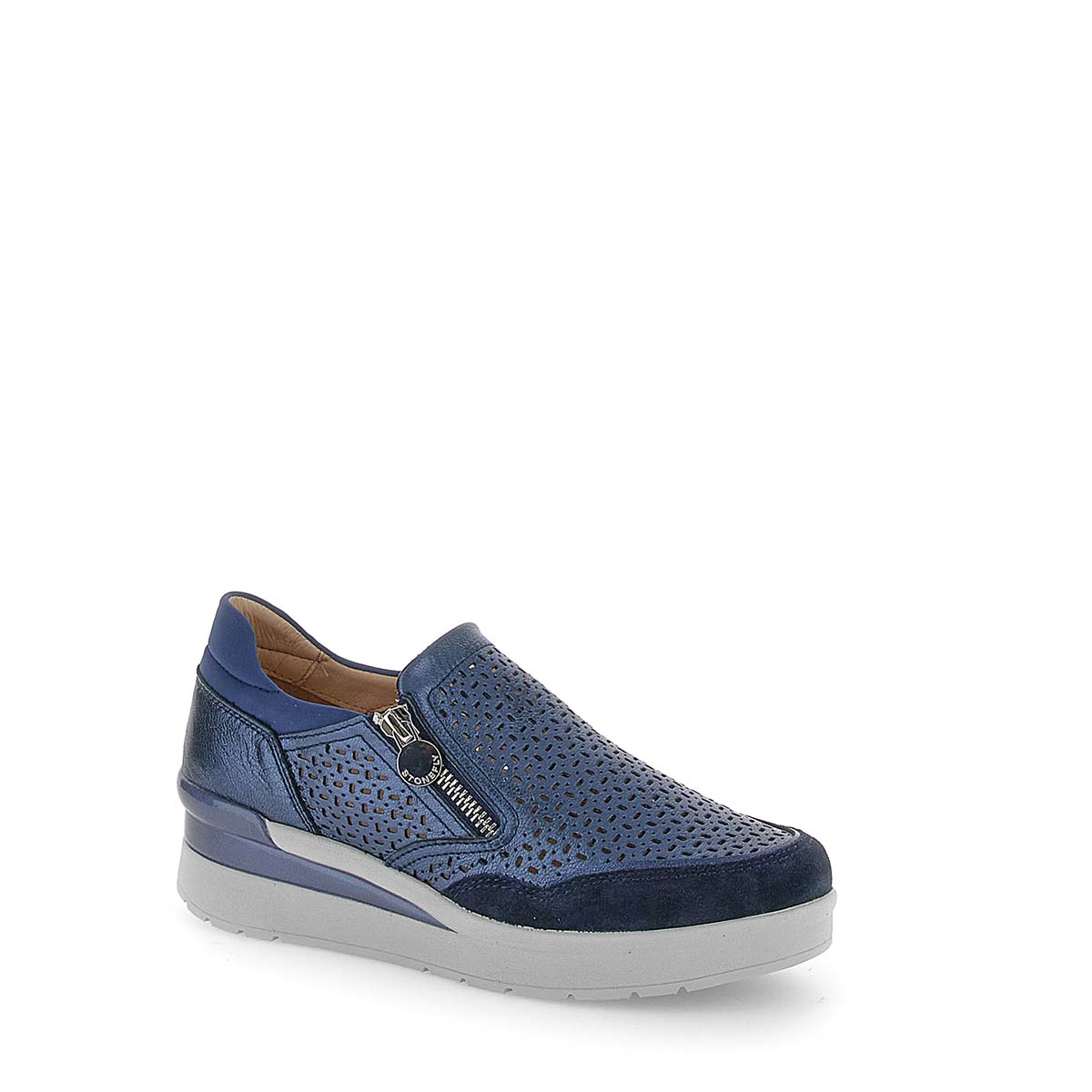 Scarpa senza lacci da donna in pelle sintetica laminata con tomaia traforata per assoluta freschezza nelle giornate estive. Comoda da calzare grazie alla chiusura con coulisse. La tecnologia Blusoft® supporta la tua camminata garantendo massimo comfort e ammortizzazione. Suola in EVA, altezza tacco (cm): 5.