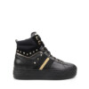 Sneaker alte in pelle con inserti in vernice a contrasto, borchiette decorative ed elastico laterale bicolore. Colletto imbottito e fondo EVA di 4 cm. Il sottopiede con tecnologia DryGO! Assorbe l’umidità e garantisce confort e benessere. Made in Italy