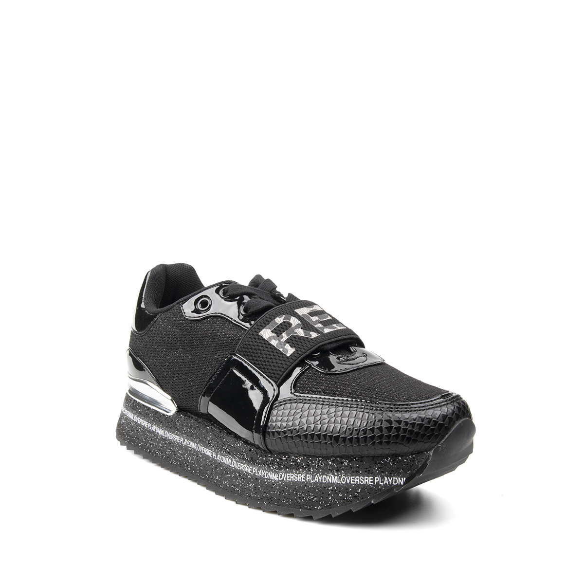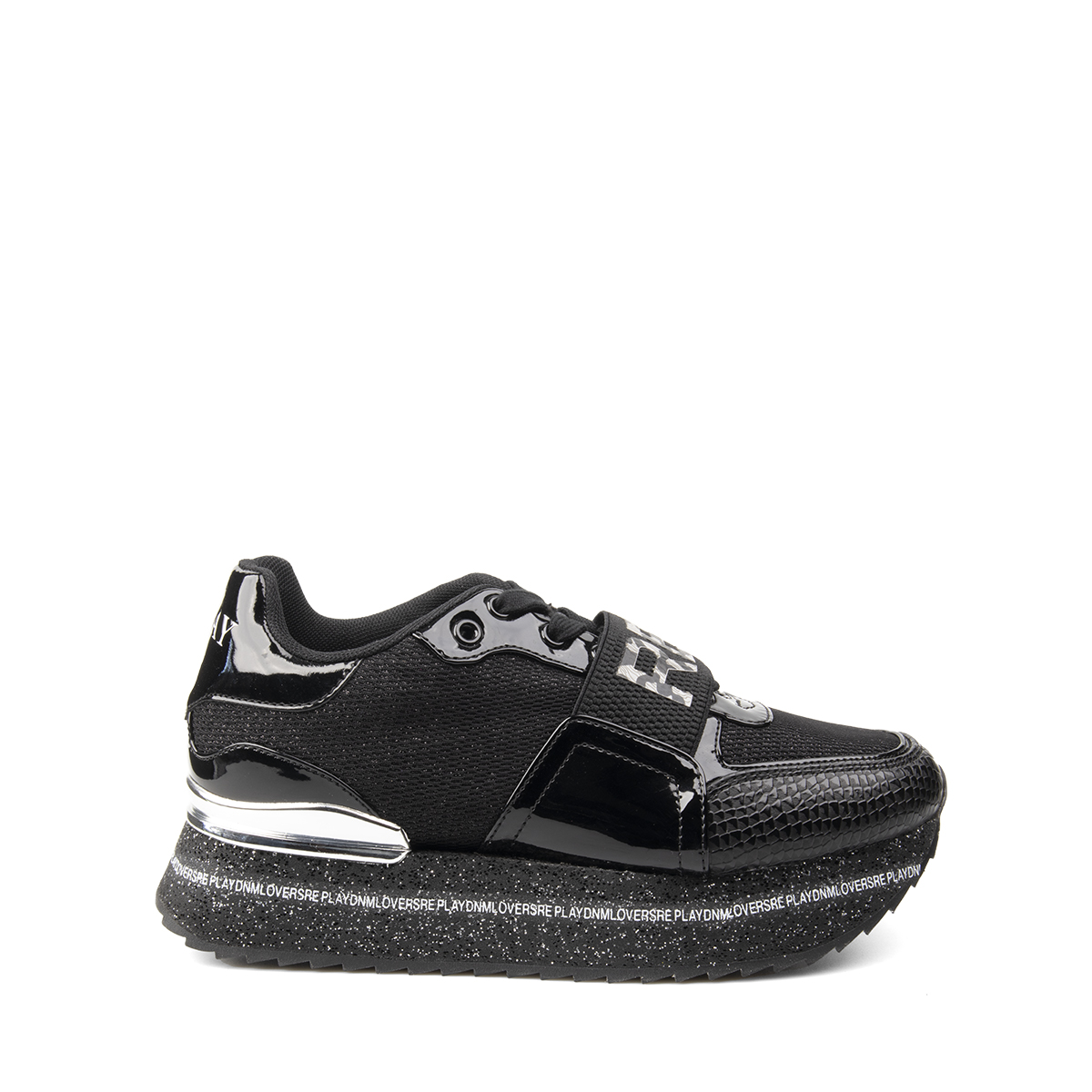 Sneakers donna lacci MANHATTAN con suola alta, pelle e tessuto laminato, inserti lucidi, etichetta con logo sulla linguetta e logo stampato sul retro.