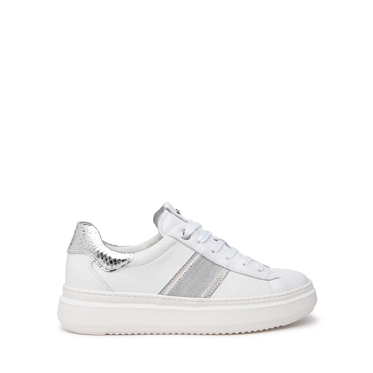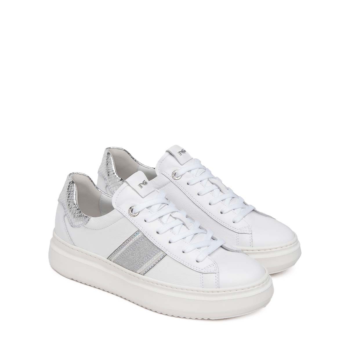 Sneakers donna Nerogiardini con chiusura con lacci in tessuto. Tomaia in pelle total white con inserti laminati a contrasto. Lavorazione artigianale made in Italy
