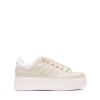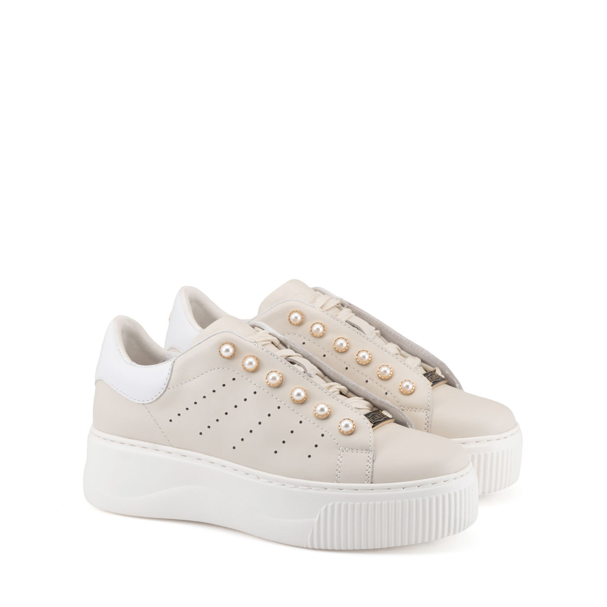 L’eleganza incontra la ribellione: questa sneaker in pelle ridefinisce lo stile glam-rock con dettagli di perle borchiate e una maxi platform decisa. Il perfetto equilibrio tra raffinatezza indipendente e attitudine urban.