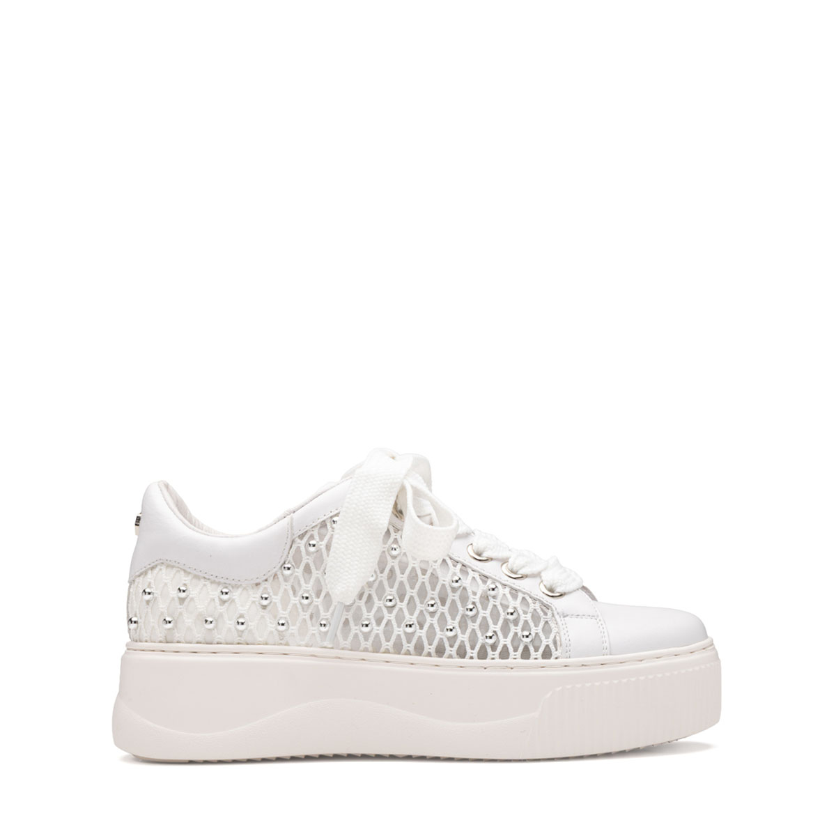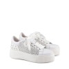 Trasparenze rock e attitudine urban: questa sneaker in pelle gioca con una texture a rete impreziosita da micro-borchie. La maxi platform iconica eleva un design audace, perfetto per un look indipendente che non passa inosservato