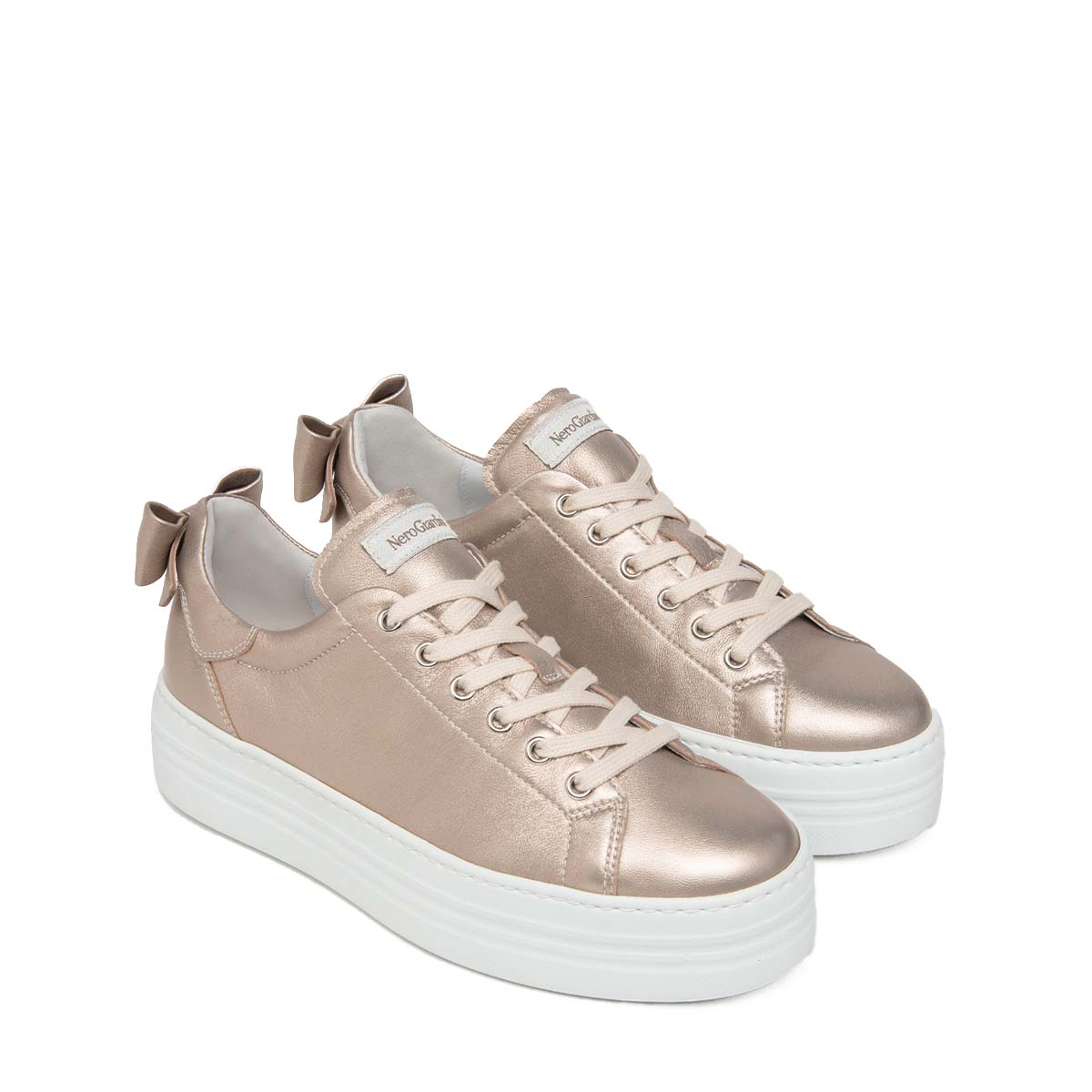 Sneakers dorata in vero cuoio con fiocco sul tallone. Chiusura con lacci bianchi. Box logo sulla linguetta. Suola in gomma leggermente rialzata. Soletta in vero cuoio forata. 100% Made in Italy.