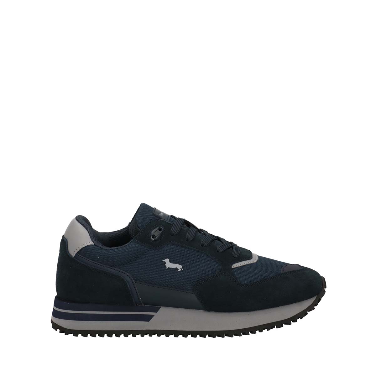 Sneaker essenziale proposta in camoscio con inserti in tessuto tecnico. Il modello è caratterizzato da suola con dettagli colorati a contrasto e spoiler logato in PVC sul tallone, abbinato alla stampa del bassotto Blaine serigrafato sul laterale. La calzatura è arricchita dal motivo della cucitura a zig-zag e lacci bicolore, Ideale per chi non vuole rinunciare allo stile e al comfort.
