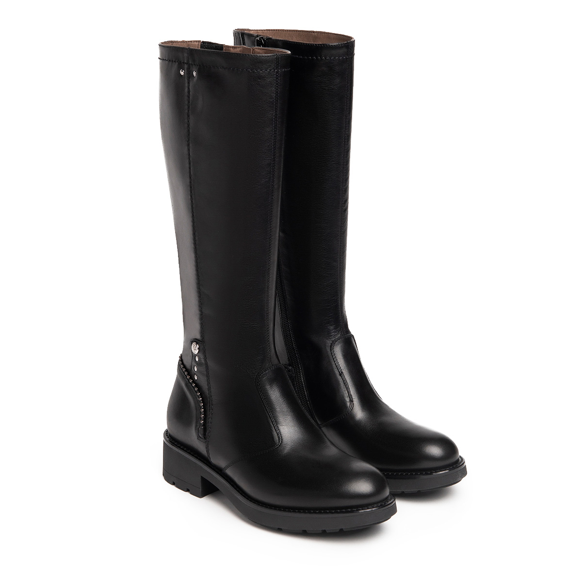 Stivale in pelle nera con zip laterale borchiette e sottopiede in vera pelle. L’articolo con codice I205804D ha il gambale alto 35.5 cm.