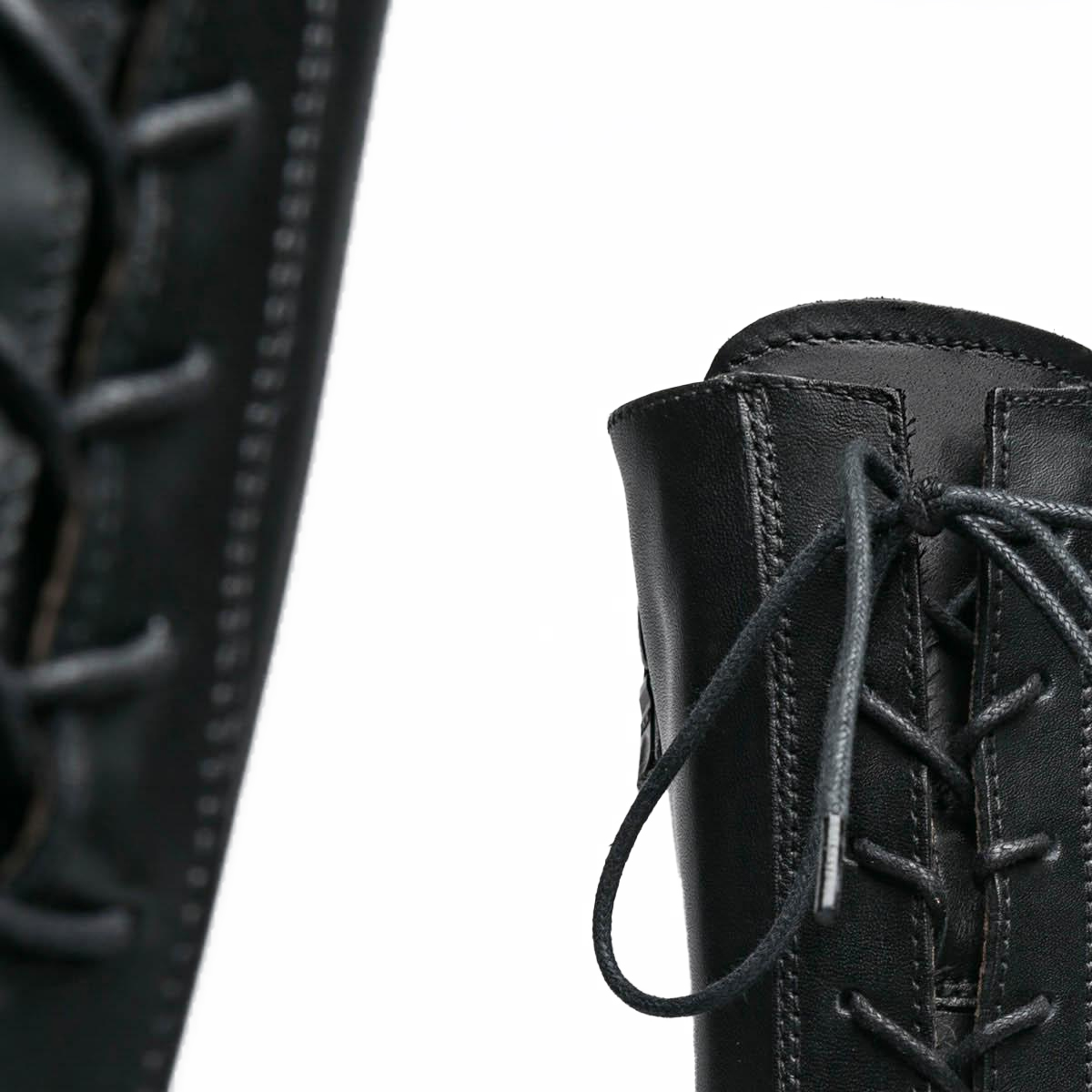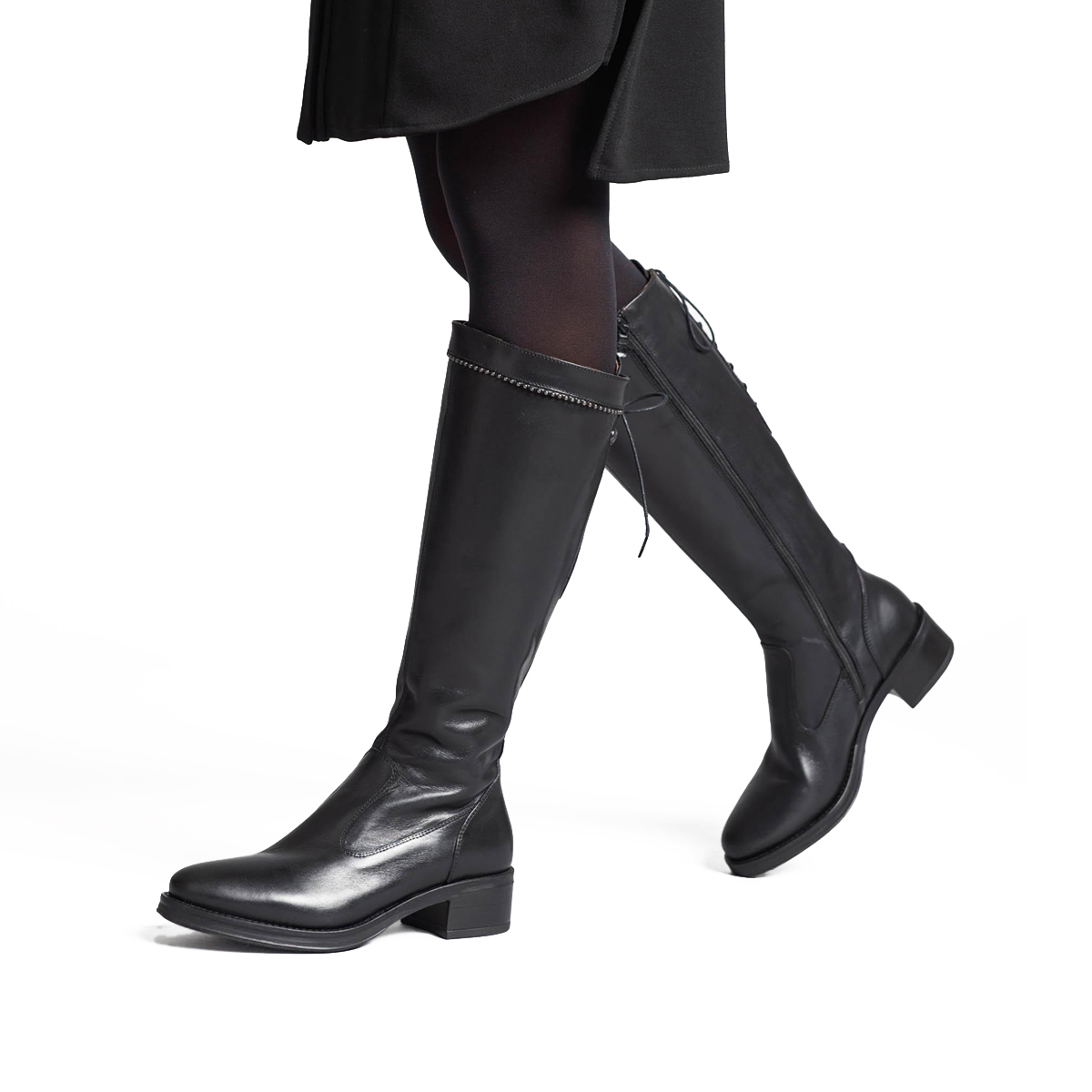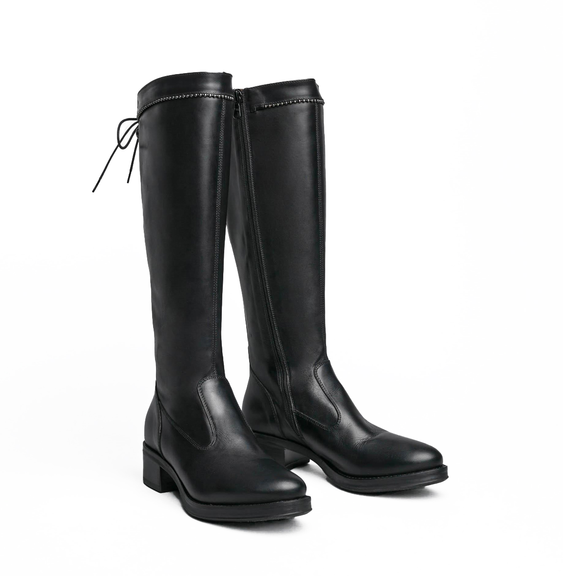 Stivale stile cavallerizzo in pelle. Tacco da 4 cm, la zip interna, i lacci nella parte alta del gambale e il morbido sottopiede assicurano una calzata agevole e veloce. Linee essenziali per un look glamour. Made in Italy.