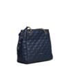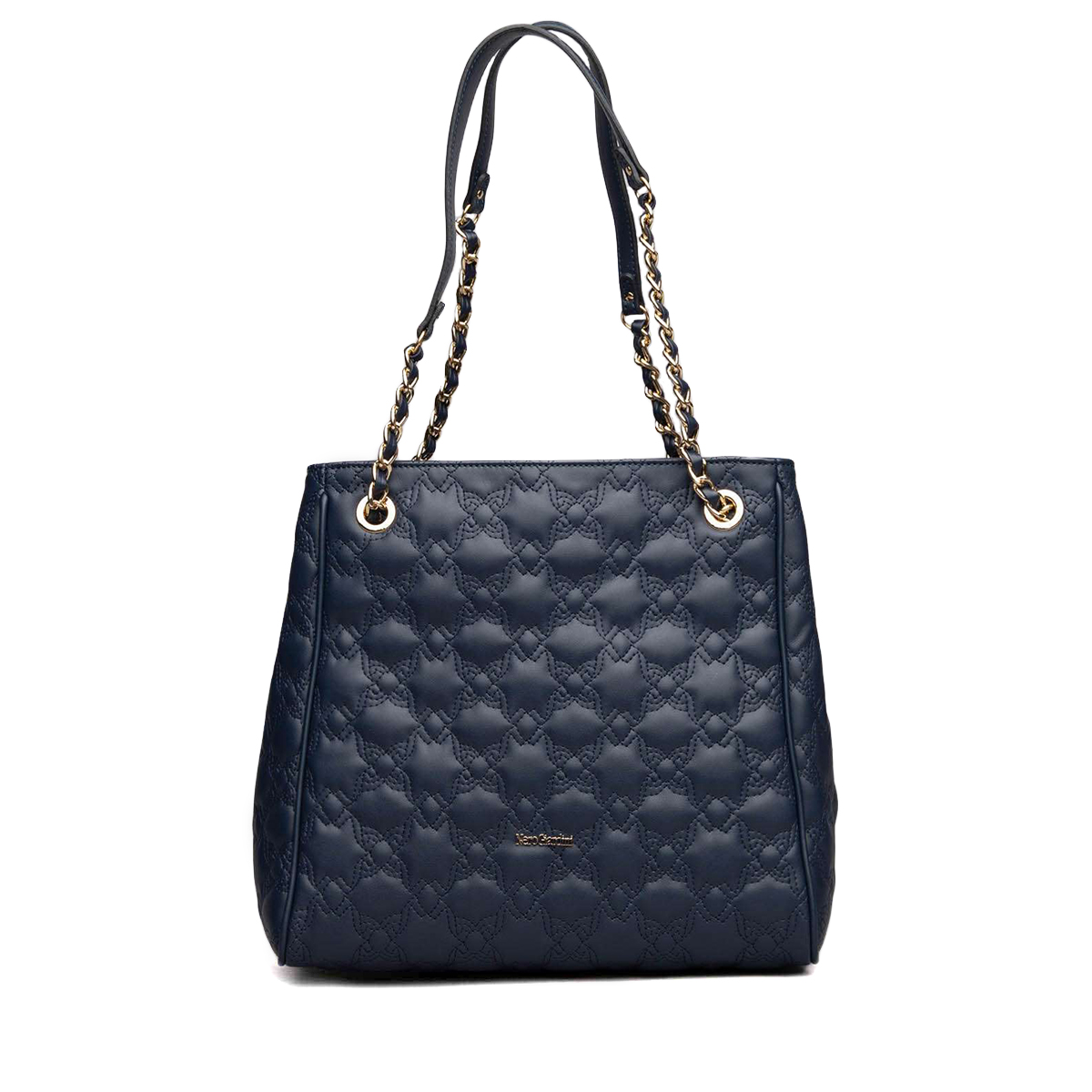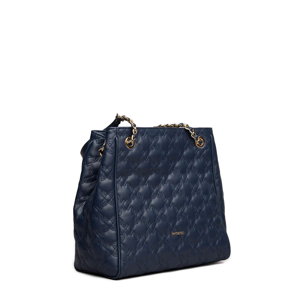 Borsa a spalla realizzata in materiale tecnico effetto matelassé con manici scorrevoli a catena. Ampio scomparto interno con tasche di servizio. Comoda chiusura con bottone automatico. Dimensione: 29×26,5×14,5