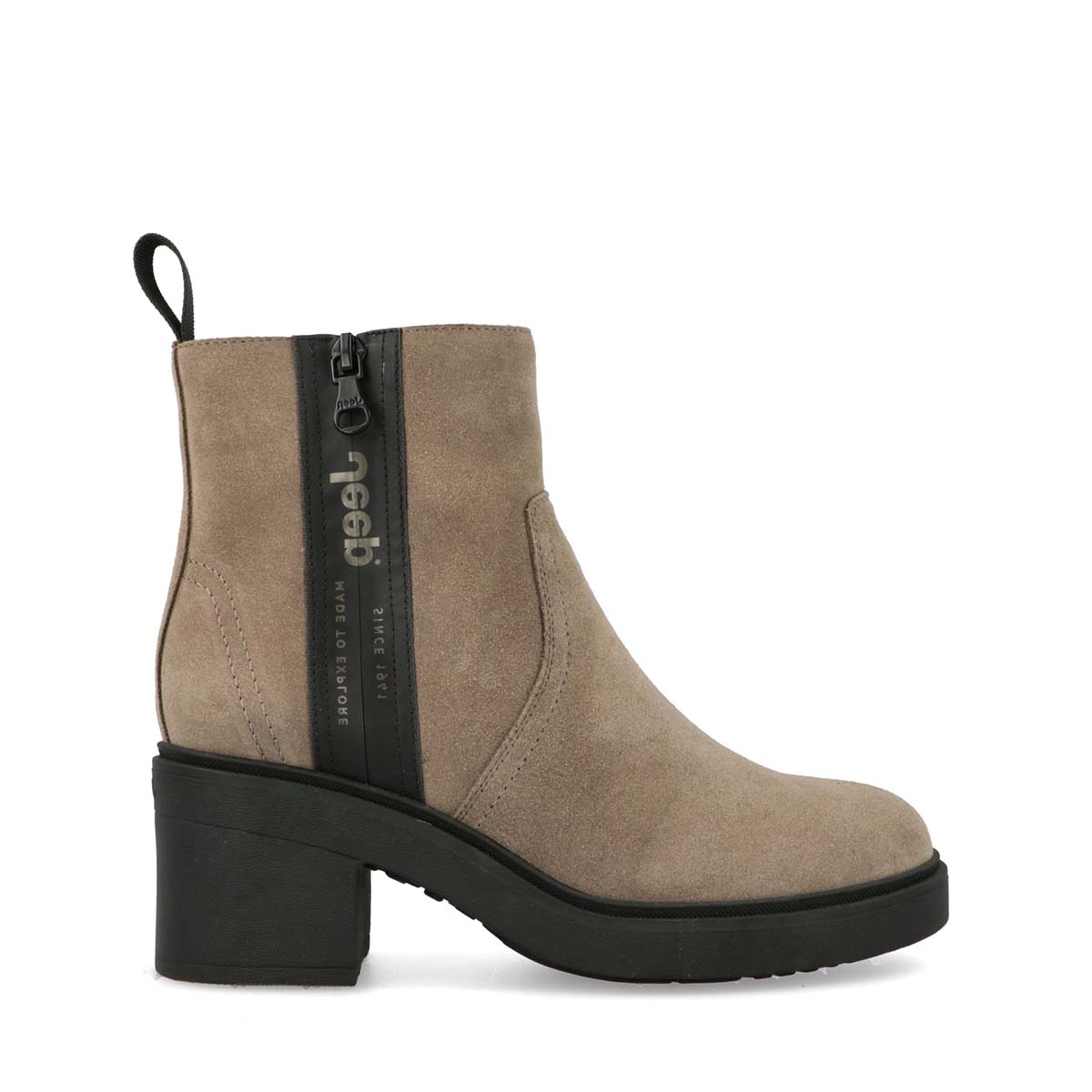 Stivaletti da donna di Jeep shoes.. In morbida pelle scamosciata color tortora di ottima qualità. Con un tacco spesso e stabile e una patta nella parte anteriore per un maggiore comfort. Si aprono e si chiudono con una cerniera per una maggiore praticità.