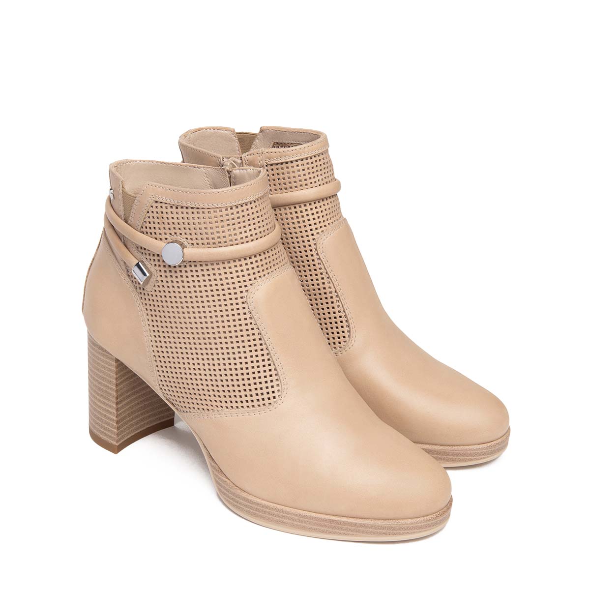 Tronchetti donna Nerogiardini con chiusura con cerniera applicata sul lato interno. Tomaia in pelle con inserti traforati e dettaglio fibbietta con logo in metallo