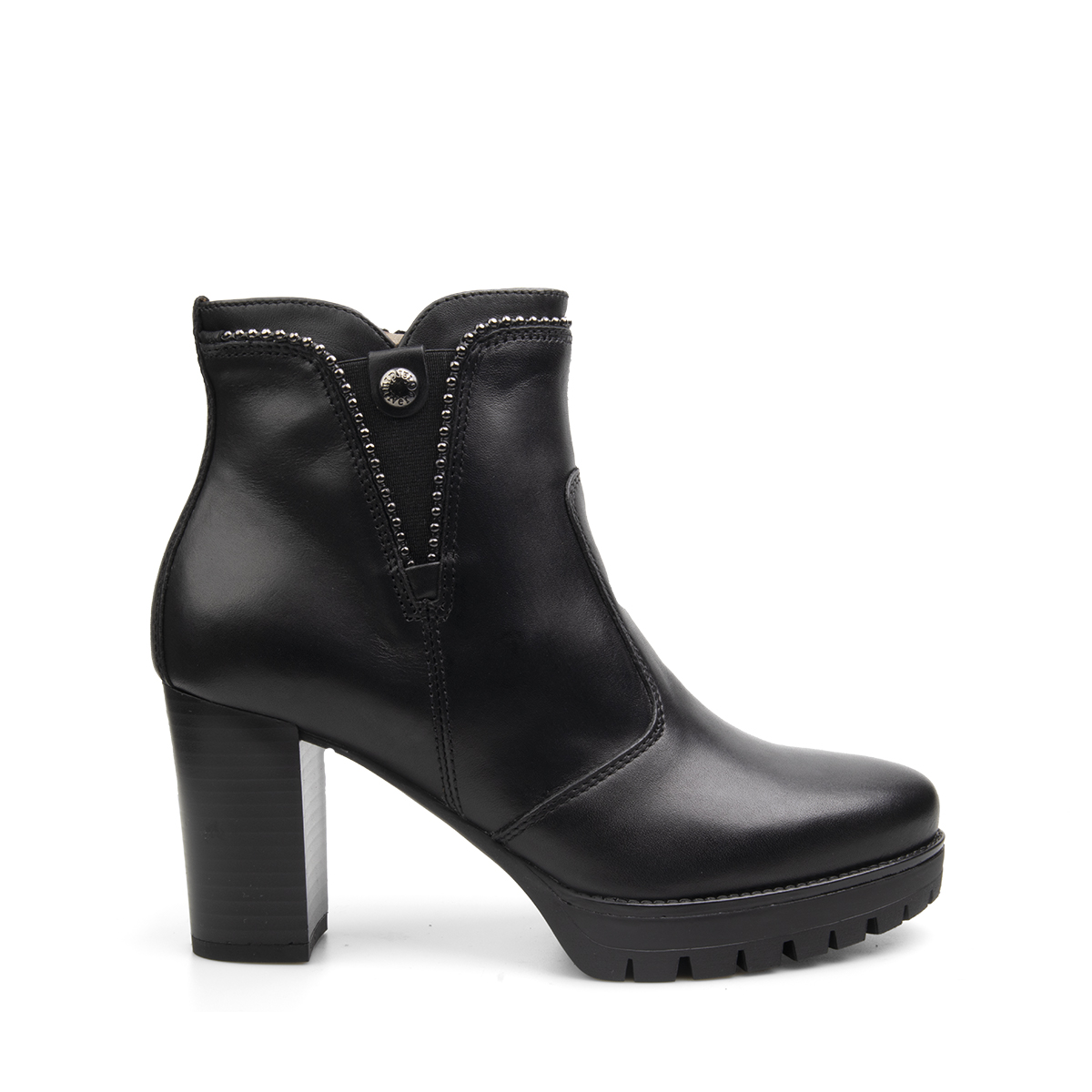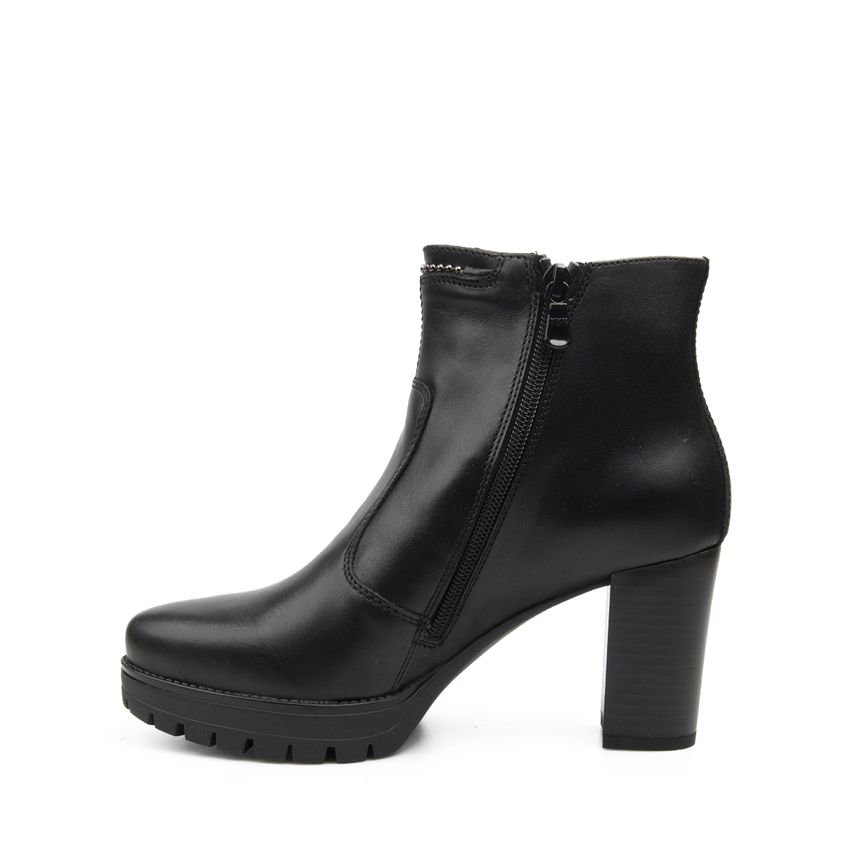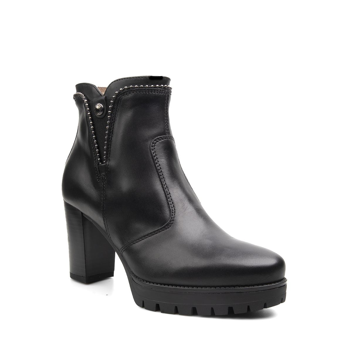 Tronchetti in pelle con chiusura a zip. Fondo roccia con tacco da 8 cm e plateau da 2 cm. Design grintoso per un look glamour. Made in Italy.
