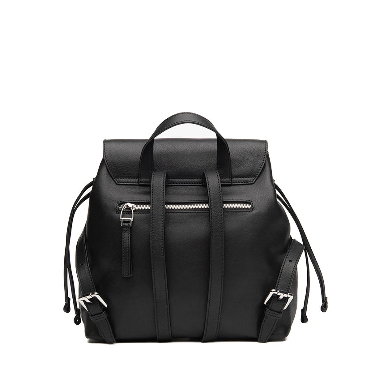 Zainetto realizzato in morbida pelle con comoda chiusura con bottone magnetico e pratici lacci laterali.